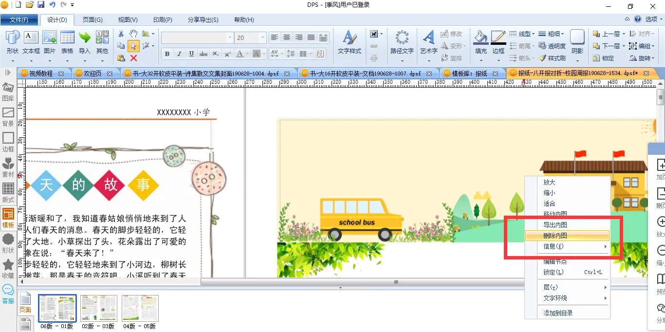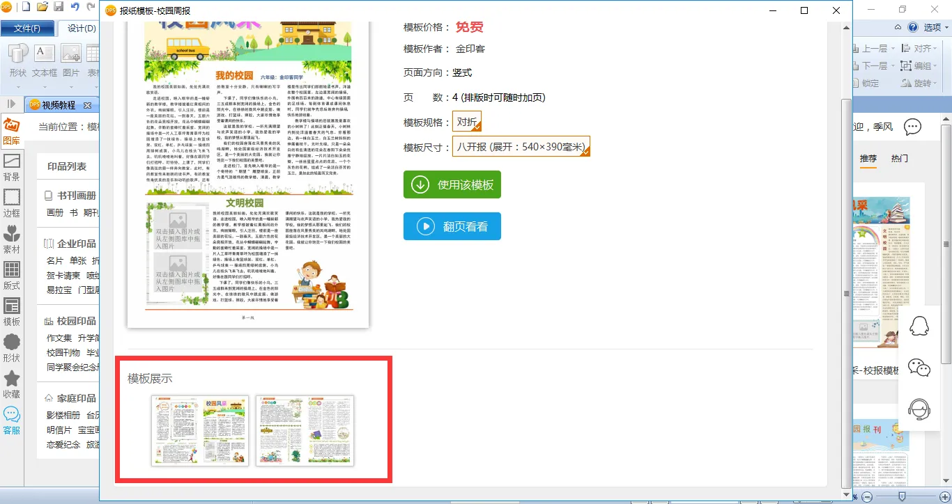 在这些模板中有校园报、企业报和新闻报等几种类型,你可以根据自己需要制作的种类来选择。当然,现实中的报纸种类并不只有这几种,比如还有作文报、书法报、文化报、财经报等等,但你都可以用这些模板来排版。我们假设自己要做的是校园报,可以在模板上方的搜索框中输入【校园】两字,就能找到模板中的校园报了。