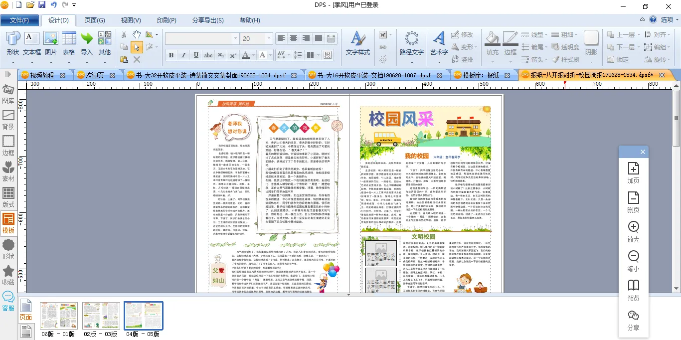 这里的模板是大八开四版的,如果你需要更多的版面可以选择【加页】,先加入空白页,然后再打开左侧编辑栏的【模板】,找到一个你需要的页面,插入到空白页之中就可以了。