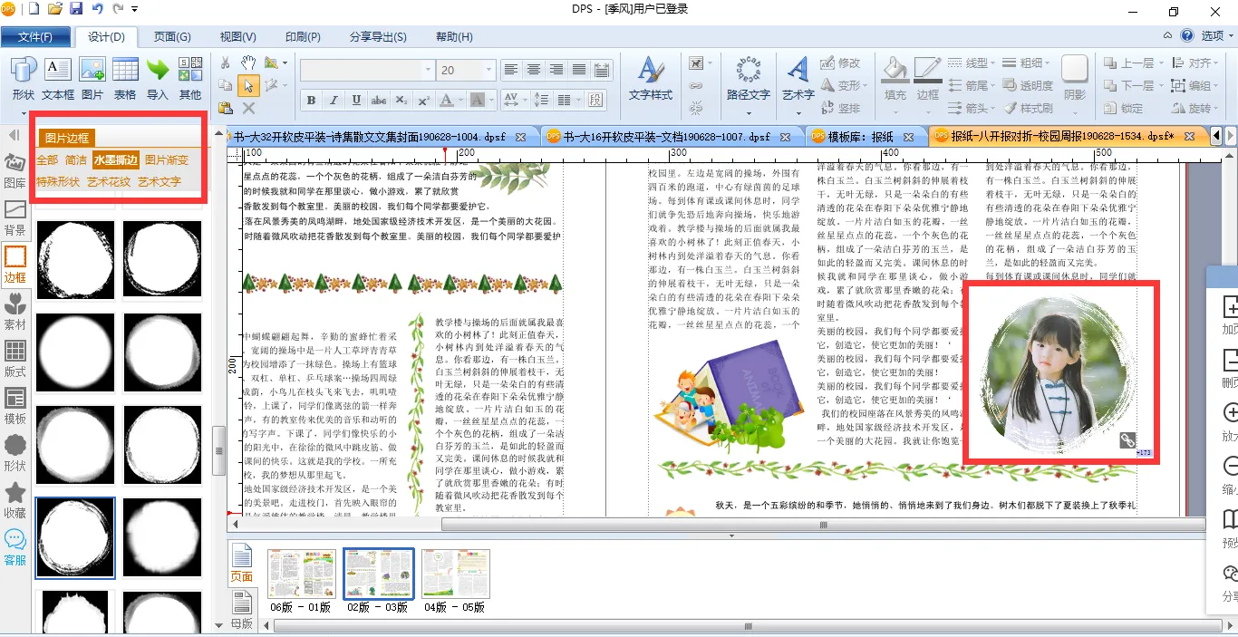 如果觉得插入的图片样式太单调,还可以对图片进行处理。具体做法是,选中插入的图片,打开左侧编辑栏的【边框】,选择【水墨撕边】,就可以对图片进行撕边效果的处理了。