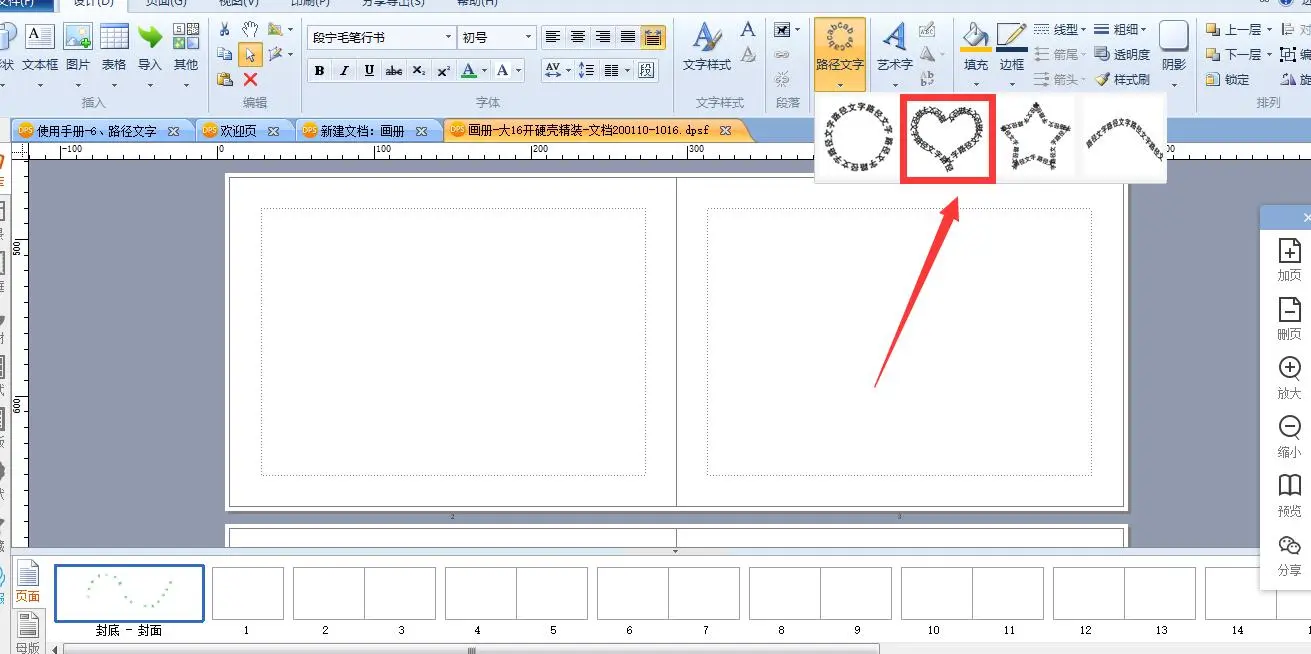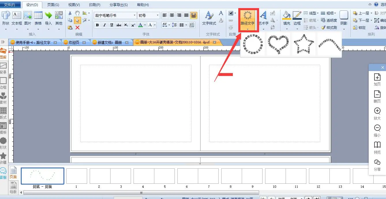 点击工具栏的“路径文字”。可以看到出现了一些不同的路径形状。