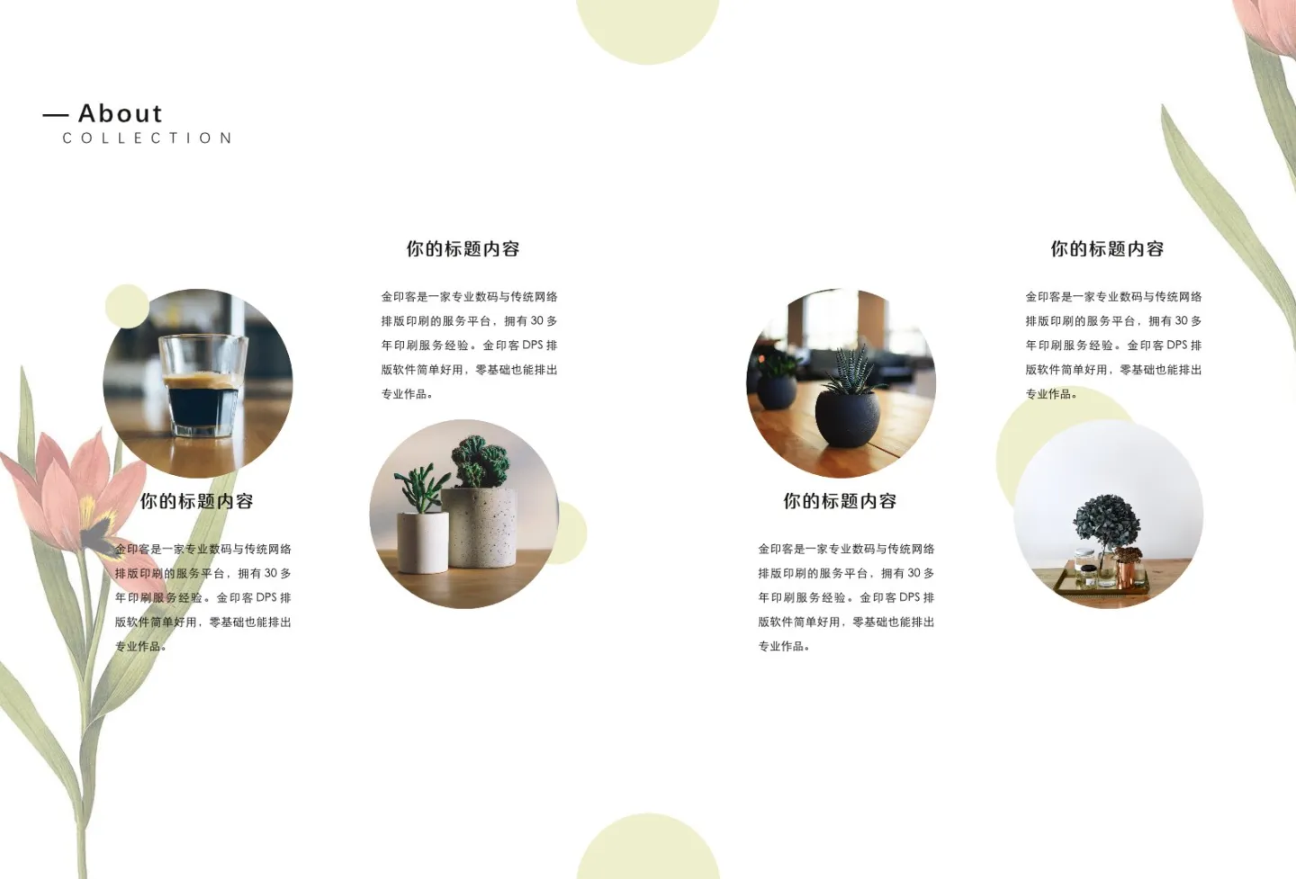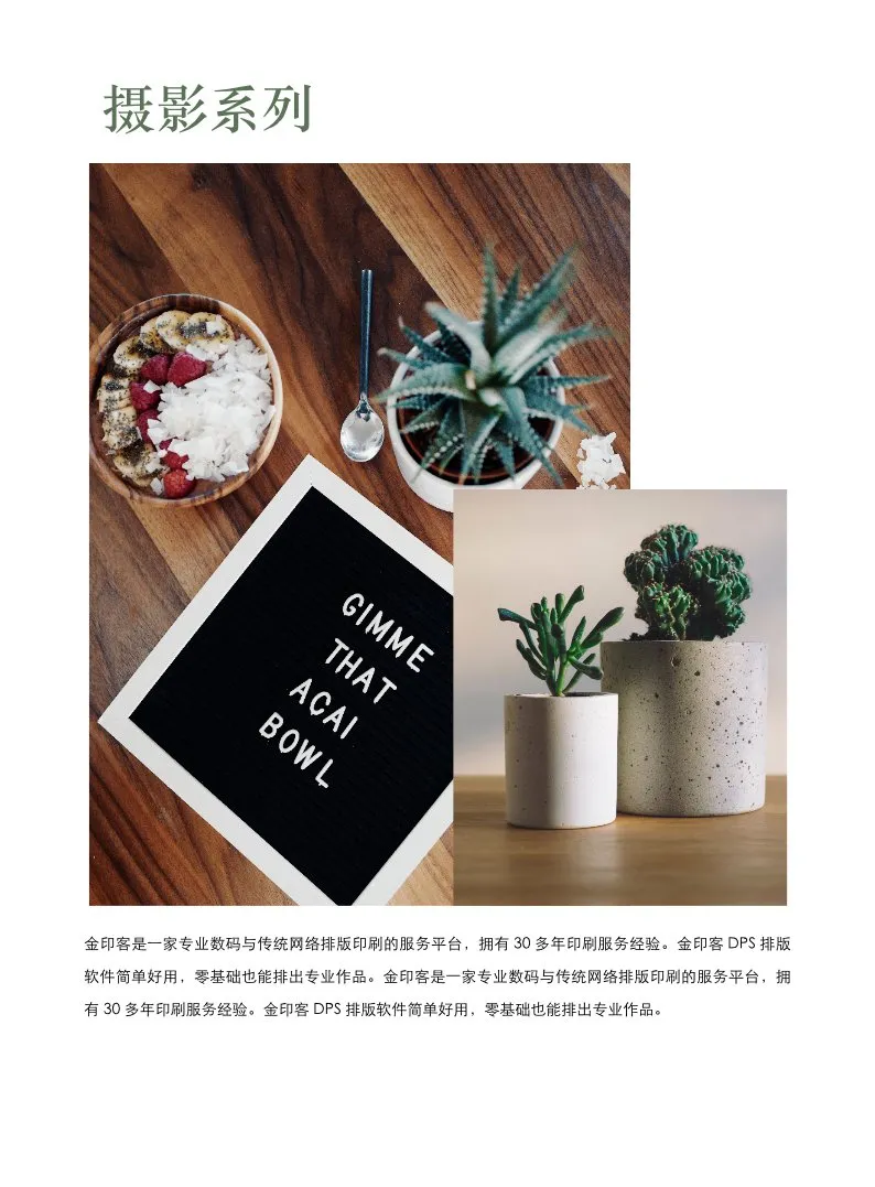 每个版面都做了艺术风格的设计,精心设计了图片摆放的版式,并预留了文字放置的空间,是不是非常的“文艺”呢?