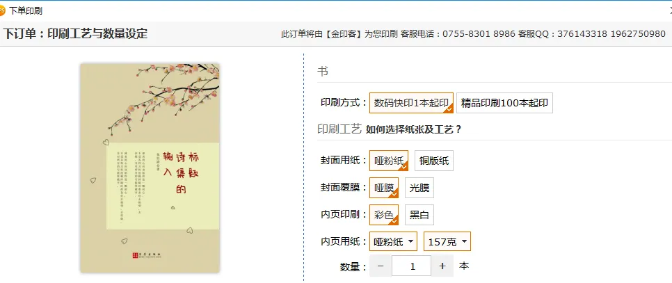 印刷时,可自行选择印刷工艺,包括封面用纸、封面覆膜、内页印刷、内页用纸,以及印刷数量等,保证印品的质量。一本起印,下单之后2天内就能印刷完成,快递会将印好的作品直接送到你手中。也就是说,从排版到印刷到收货,你都可以足不出户,坐等作品送上门。