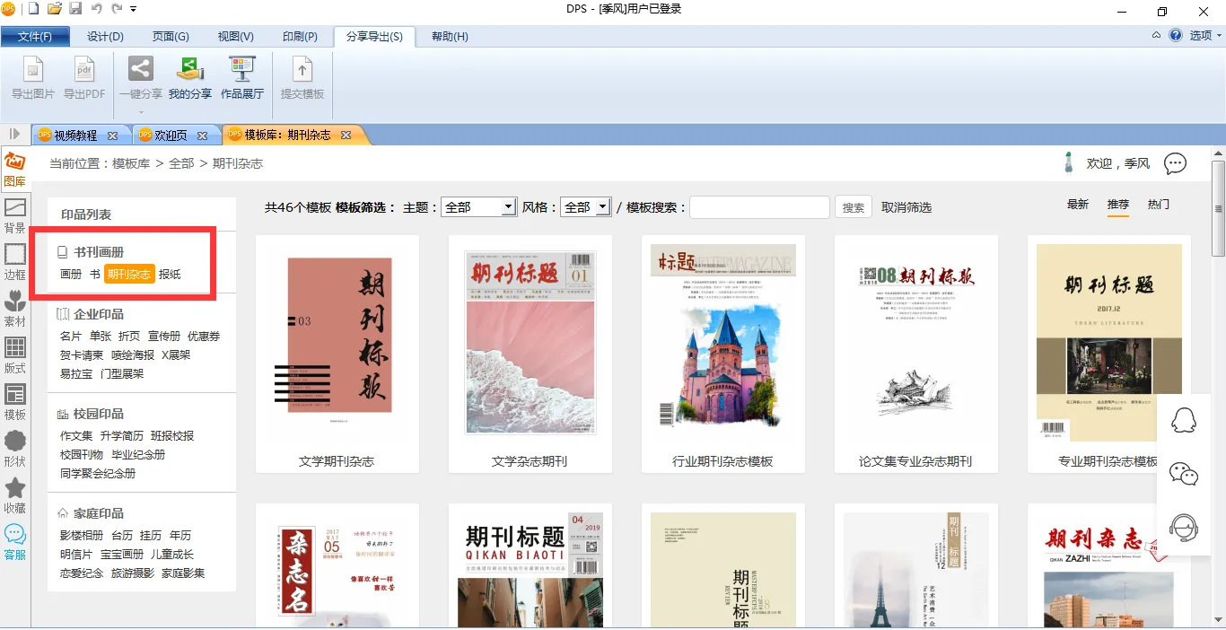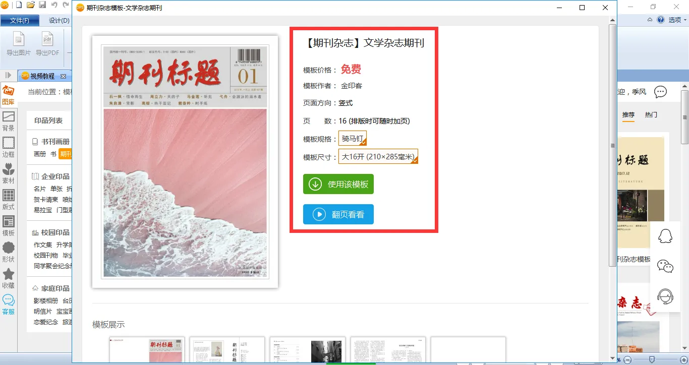 那么,这些模板要如何使用呢?首先你需要在电脑上免费下载金印客DPS设计排版印刷分享软件,然后打开软件界面的【模板库】,选择【书刊画册】——【期刊杂志】,就能找到软件内的所有杂志模板。