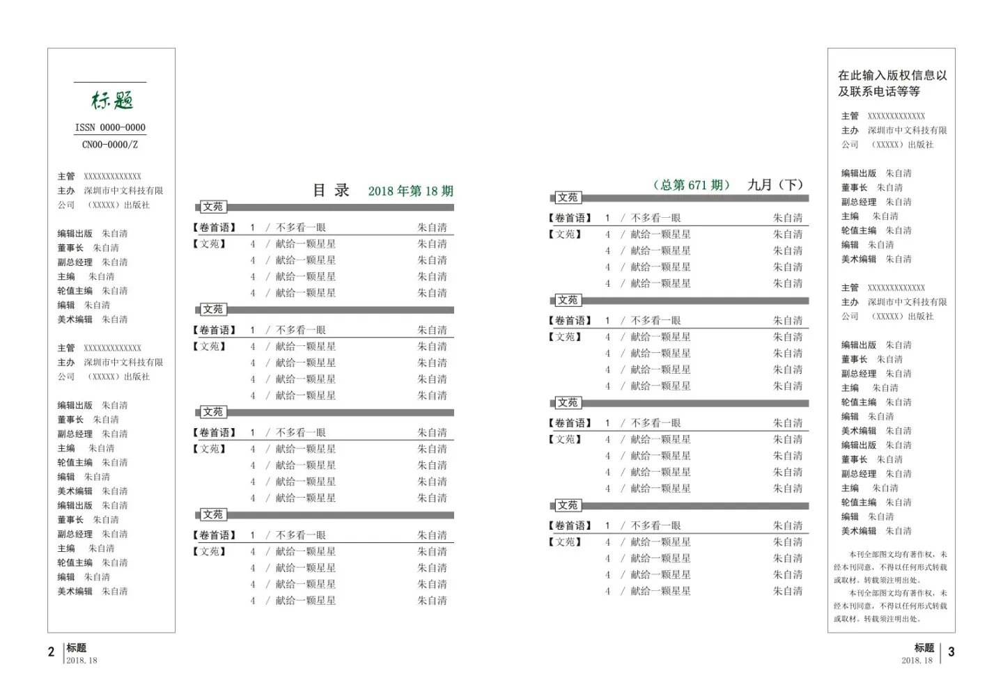 这些模板都是按照当前流行的一些文学杂志的样式来制作的,杂志的封面封底、卷首语、目录、版权页、 正文、页眉页脚、页码都已经设置好,编辑在排版的时候只需要更换模板中的文字和图片即可。