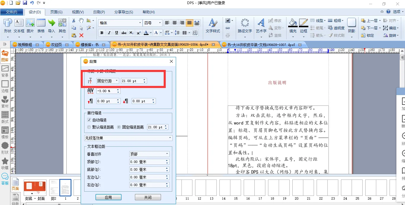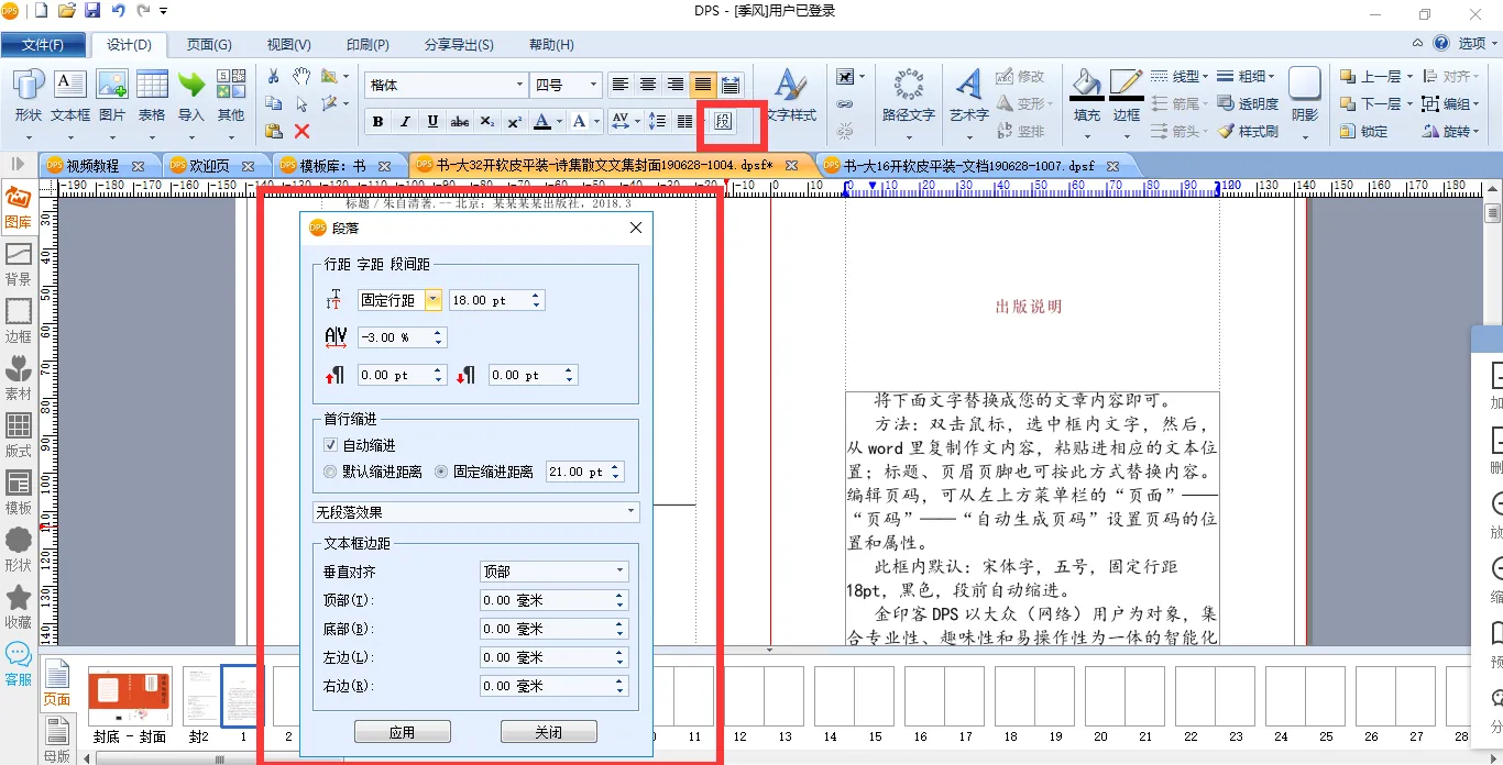 除了文字样式设置了浮动面板,【段落属性】的功能也设置了浮动面板。如果你想设置文章中的行间距,只需选中文字所在文本框,然后点击编辑栏上方的【段】,这时就有一个浮窗跳出来。