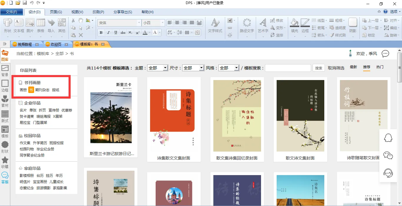 套用模板的方法也很简单,你可以先在电脑上免费下载金印客DPS设计排版印刷分享软件,然后在软件内的模板库中,选择【书刊画册】——【书】,找到相应的书籍模板。