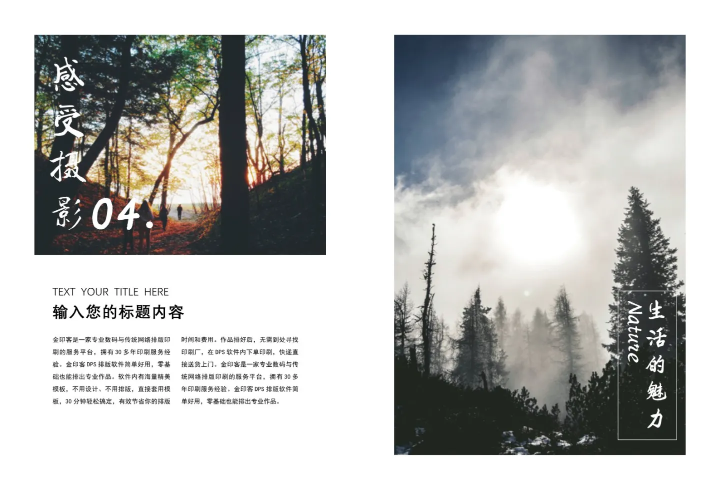 如果你想要排版的话,还可以参考金印客DPS设计排版印刷分享软件内的模板,软件可以免费下载。里面有诗集、散文集、小说集、回忆录,还有毕业纪念册、文学杂志、时装杂志、产品宣传册、产品手册、旅行画册、摄影画册等多种印刷品的精美模板,可以为你提供更多的排版参考。而且这些模板还可以免费使用哦,你想排一本精美的书籍,套用这些模板就够啦,非常的简单方便!