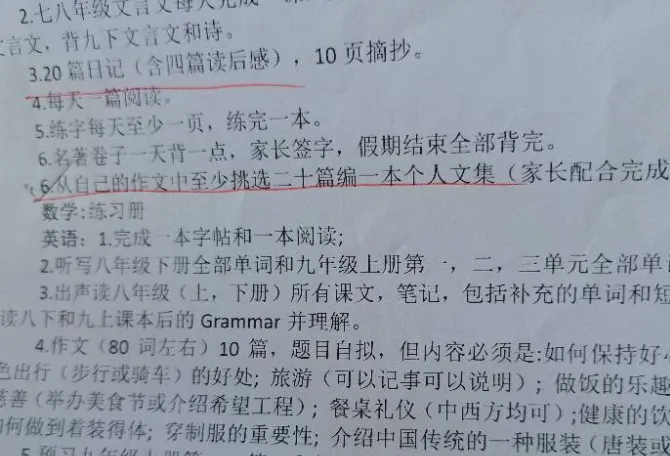 近日,小编看到一张小学生暑假作业的截图,上面明令要求学生要从自己的作文中至少选出二十篇,编辑成一本个人作文集,并且要求家长们配合完成。