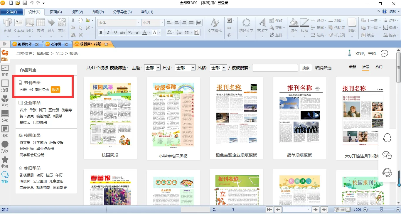 第二,打开软件界面中的【模板库】,在【书刊画册】中选择【报纸】,就能看到许多的报纸模板。有企业报、新闻报、校园报,你可以随意挑选你需要的报纸;