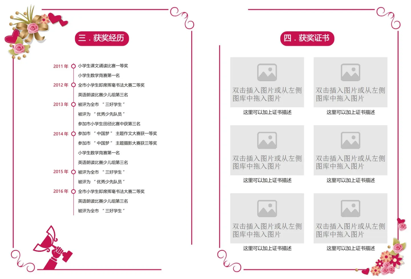 2)孩子校内外情况:校内担任的职务,成绩;校外学习情况、兴趣爱好、特长、社会实践等,将这些内容用表格清晰的罗列出来。不过为了避免呈现的内容太多,查看简历的老师难以找到重点,团团建议将最近四个学期取得的重点收获突出即可。