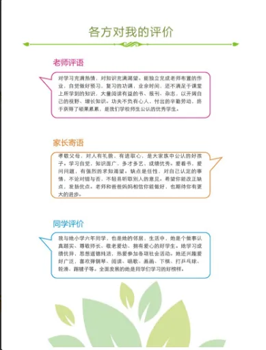 另外,还可以附上家长对孩子的评语,要既能体现自己对孩子的教育理念,又能展现对孩子教育的重视和配合。