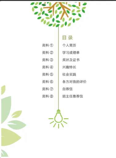 目录包括整份简历的大纲标题,然后标注好对应的页数,方便老师查找,毕竟一个老师可能一个人就要面对上百份简历,站在查看简历老师的角度来优化孩子简历。