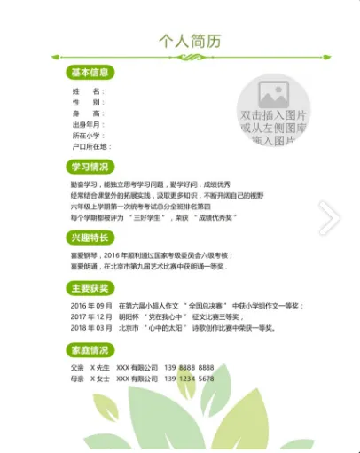 封面三要素:孩子姓名,毕业的小学,父母的联系电话放在首位,联系方式一定要检查好,不要错,方便学校有意向联系。