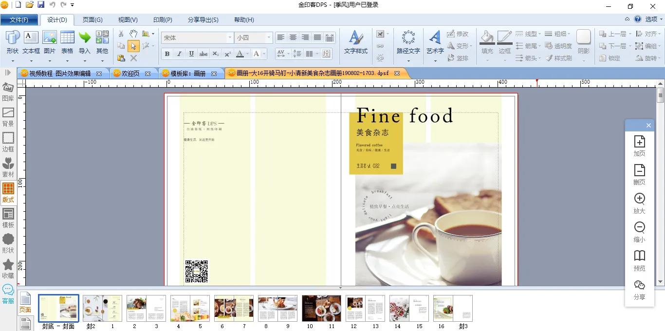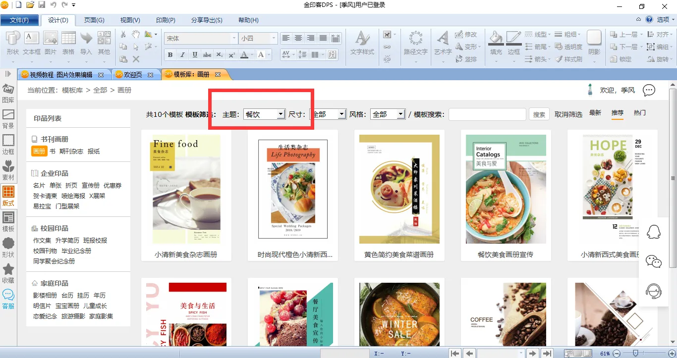 非常简单,你只需要在电脑上下载金印客DPS设计排版印刷分享软件,选择【模板库】——【画册】,然后将主题选择为【餐饮】,就能找到全部的美食画册模板了。