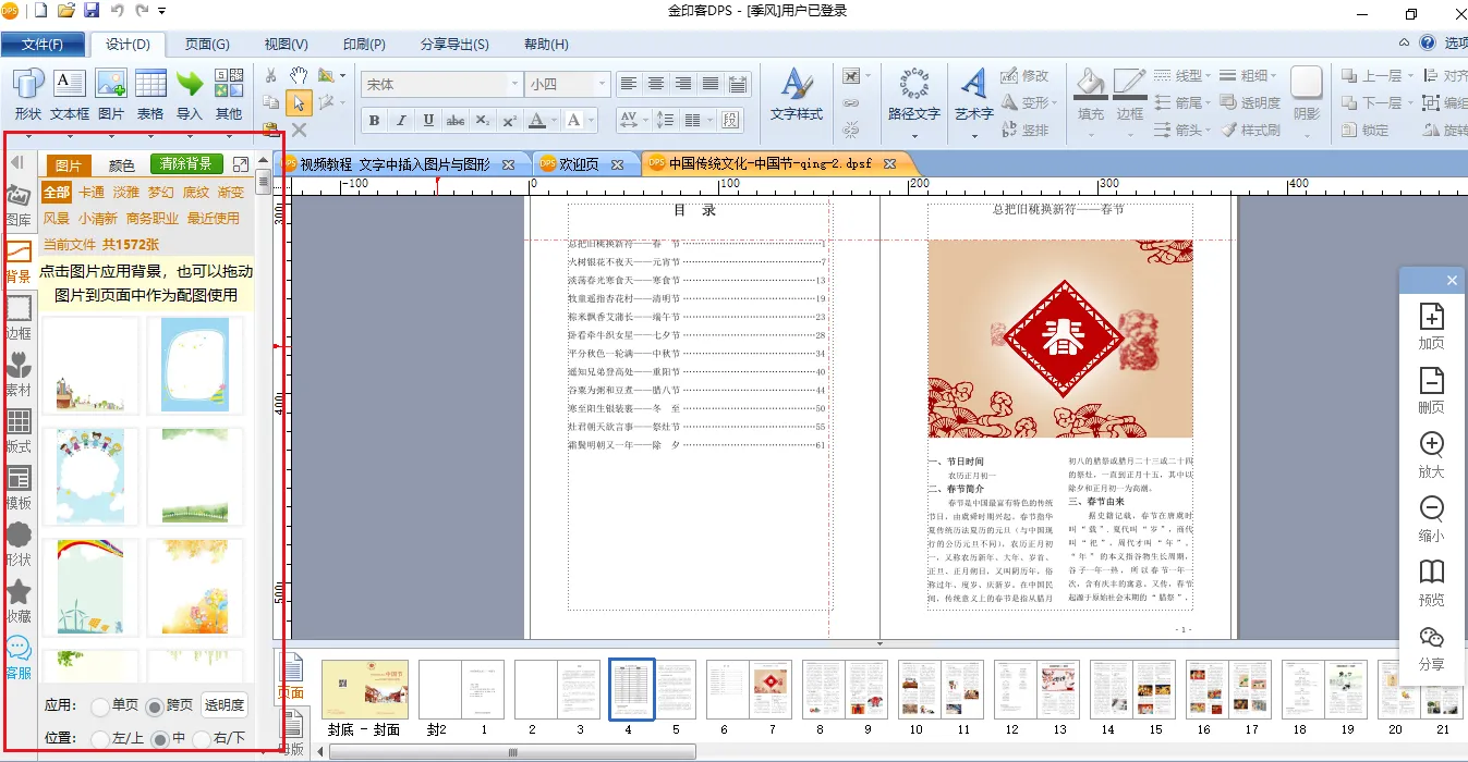 在软件编辑栏的左侧,有大量的背景图片、设计素材、图片版式、边框效果、常用图标等元素,编辑作品时可以随心选用,让你的书籍更丰富有趣。