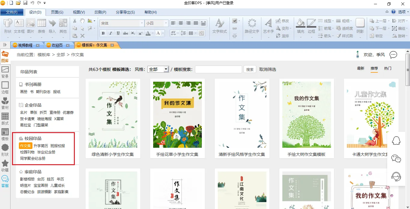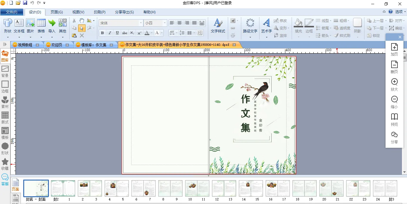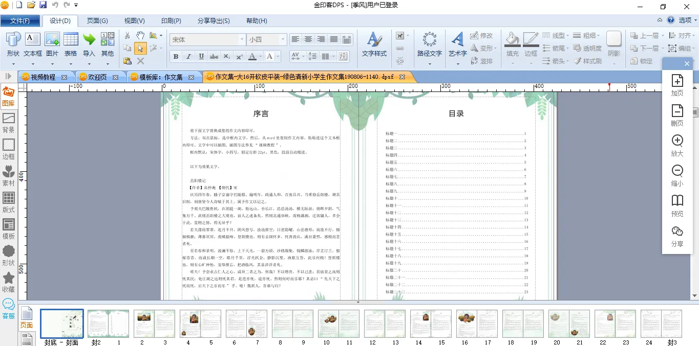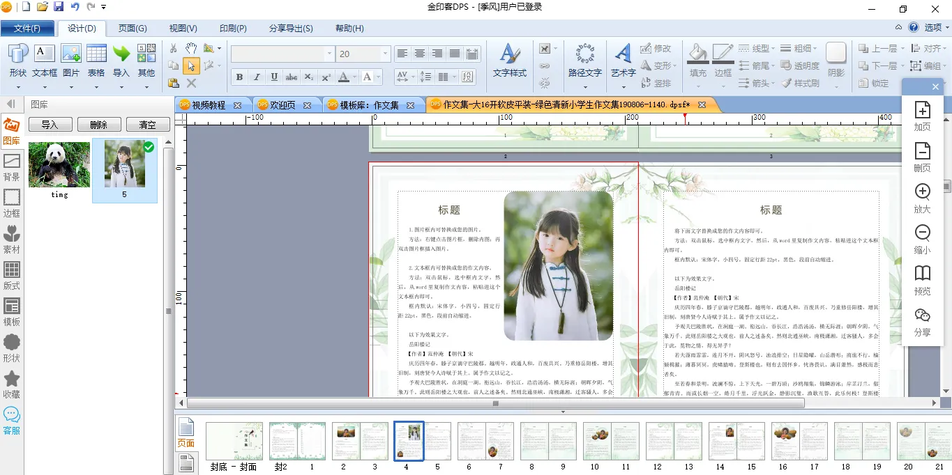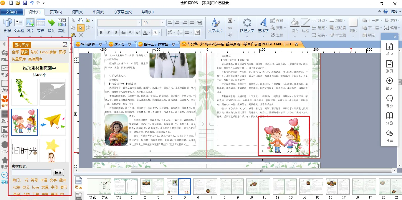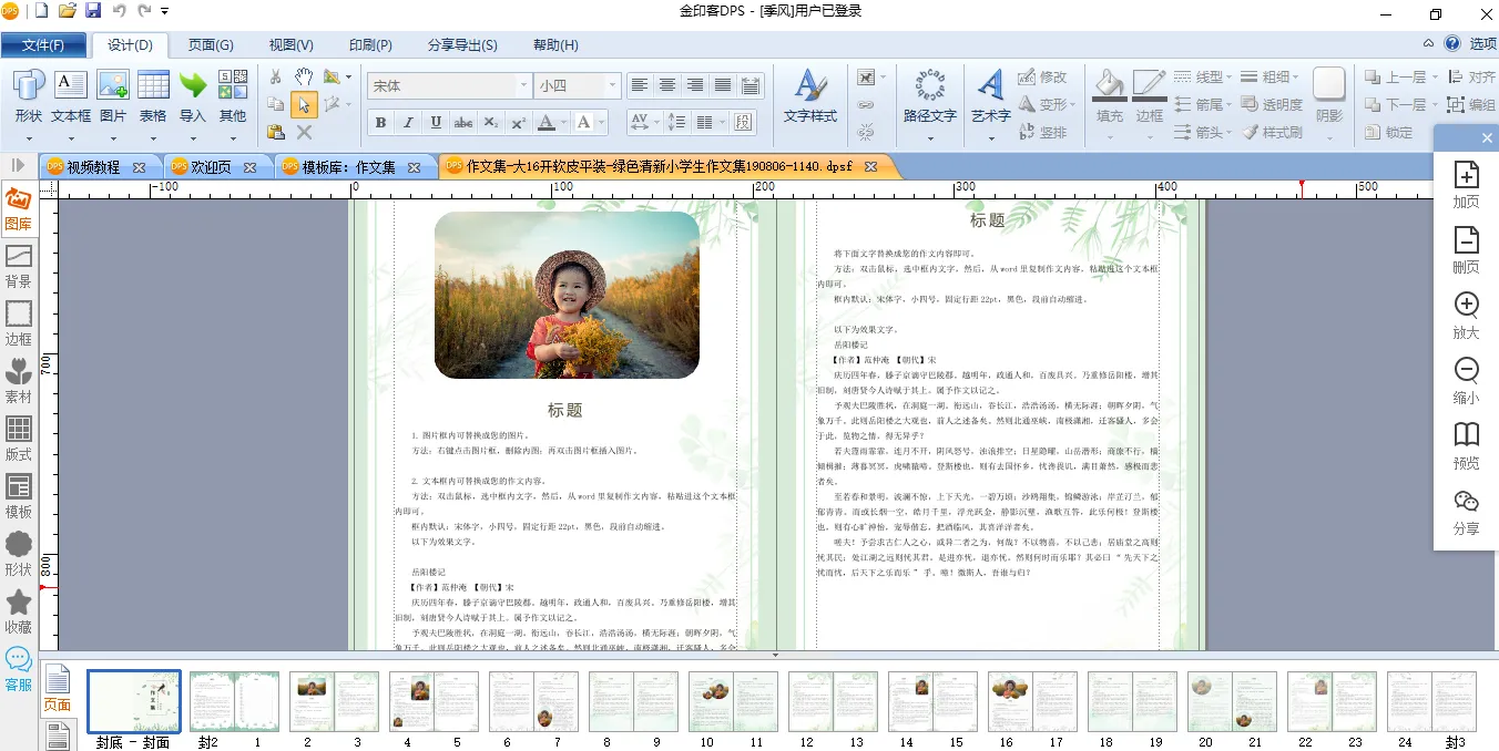 前期的准备工作都做好后,现在我们就可以开始着手制作作文集了。制作这一环原本是最困难的,但现在因为有了金印客DPS设计排版印刷分享软件,却变得超级容易。因为在软件内有各种各样的作文集模板,你可以随意套用,就像套用PPT模板一样简单。