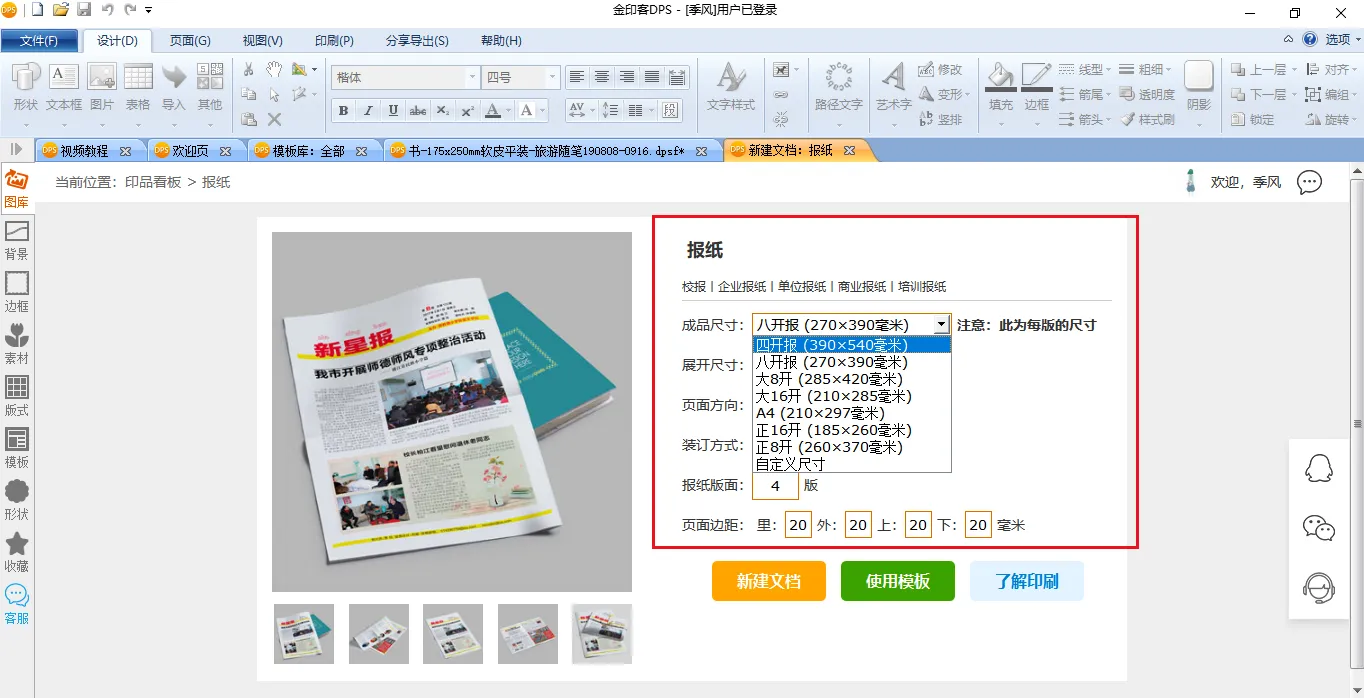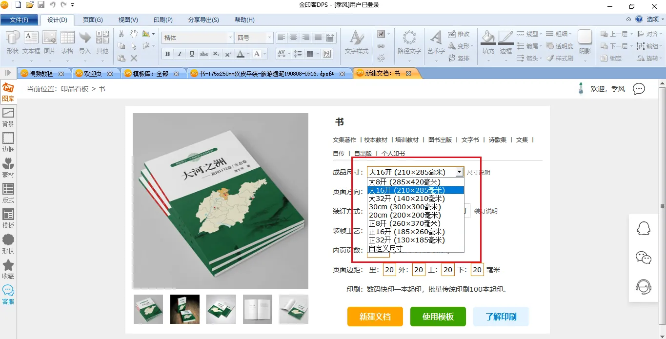 软件可以根据用户的实际需要,快速创建标准规范的图书、画册版面。比如书籍有大16开、正16开、大32开、正32开等常规书籍尺寸的选择;报纸有标准的四开、大8开、正8开等尺寸可以选择。