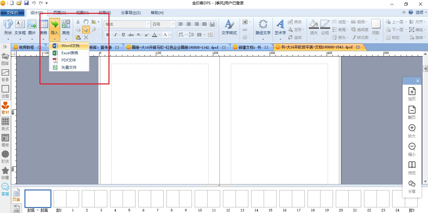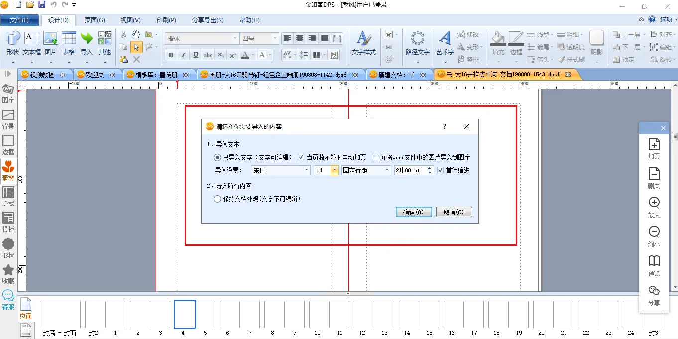 编辑图书的时候,会有许多的文字,如果是一个版面一个版面复制粘贴的话,就会十分繁琐。金印客软件具有导入Word文档的功能,可以一次性地将每一章节的文字导入到排版页面之中。具体操作是: