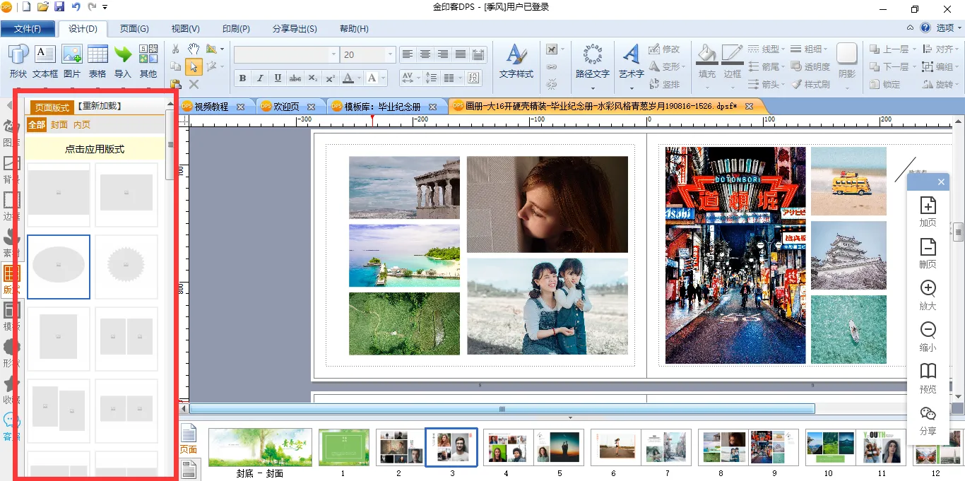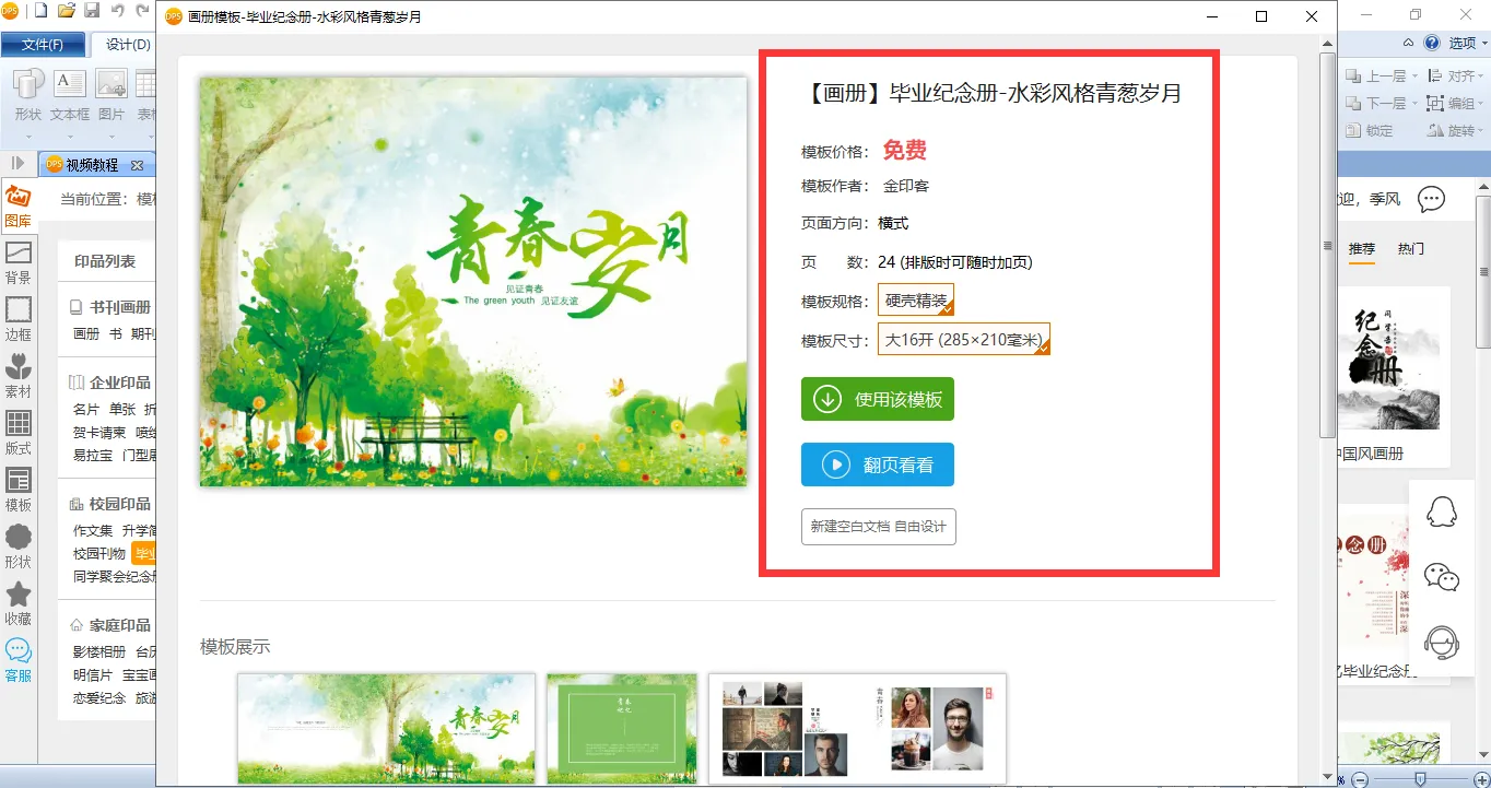 这些模板都是由金印客的设计师精心制作的,也是时下比较流行的毕业纪念册样式,用户可以随心使用。选中模板后,只需点击【使用该模板】,就可以将模板在软件内打开了。
