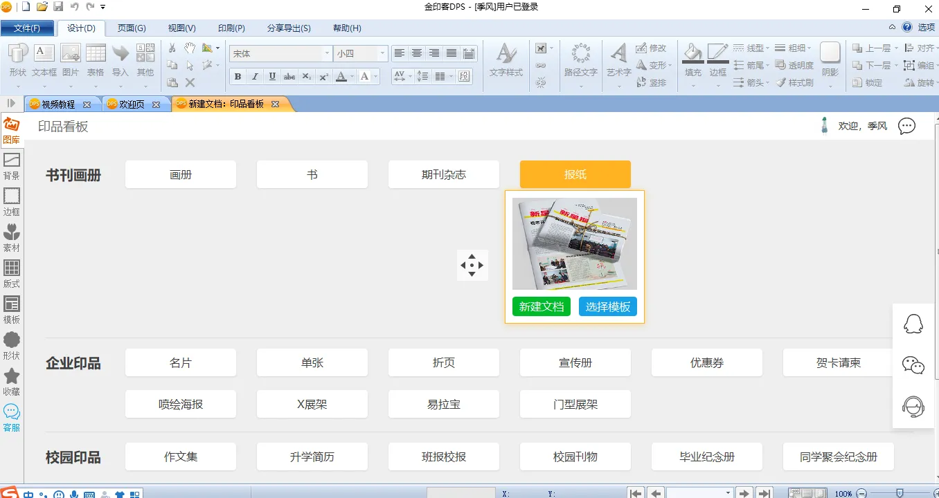 在电脑上安装了免费的企业报排版软件金印客DPS设计排版印刷分享软件后,双击打开,选择主界面【新建】,会进入一个文档格式选择的窗口。这里可以选择的文件类型有画册、书、作文集、升学简历、报纸、校报手抄报、毕业纪念册等二十几种,选择【报纸】。