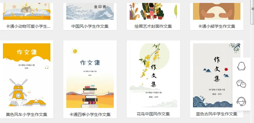 再点击左边竖列的作文集,就会出现很多的作文集封面模板。有清新风格的、可爱风格的、有中国风,还有卡通形的……