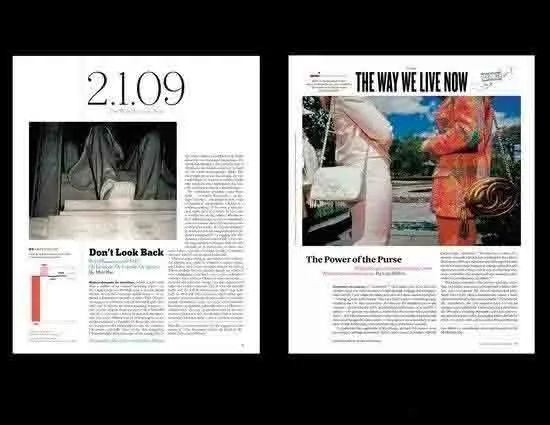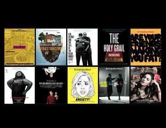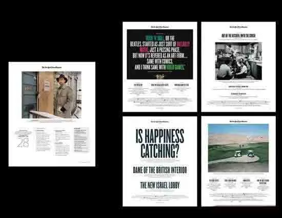 纽约时报杂志的设计延续了现代主义的设计风格,是本很年轻的杂志。封面用色大胆活泼。每个封面都很吸引眼球。内部版式很多都打破常规,字体与图片关系紧密。