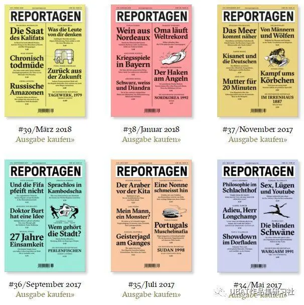 Reportagen是两个月出一次的一本文学报告杂志,是的,大写的文学!报告!想想国内的学术杂志期刊再看看这本是不是觉得不可思议?出版商为瑞士的Puntas reports AG ,设计团队是苏黎世的一个设计工作室:Moire。这本杂志真是将瑞士的平面风格发挥到极致,规整的网格,把字体当作图像元素撑起整个版面,用大量饱和度高的色彩。这本杂志的设计是字体设计很好的参考。