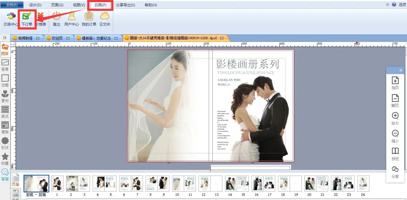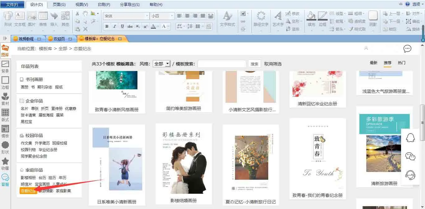 在电脑上装上软件后,就可以开始 纪念册排版了,点击模板后,选择左侧家庭印品下面的恋爱纪念,就会出现好多的模板,将模板里的图片和文字替换成自己的图片和文字,进行纪念册排版,就有了一本专属于你们的结婚纪念册了。