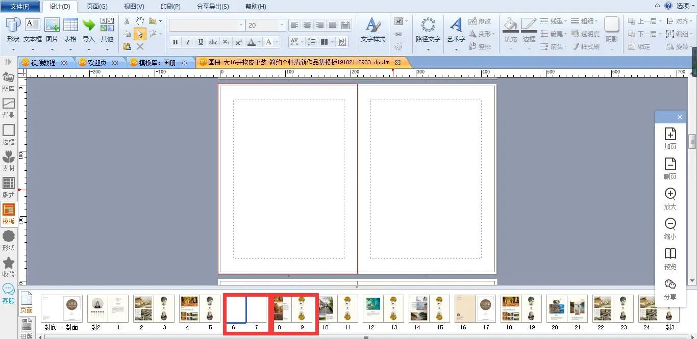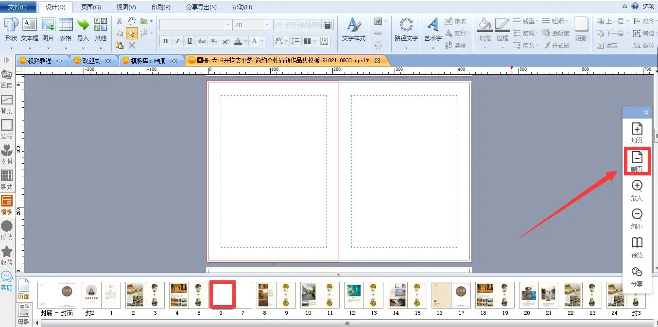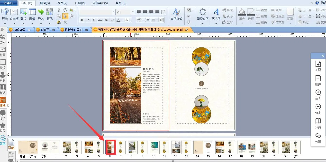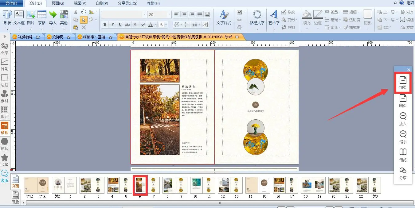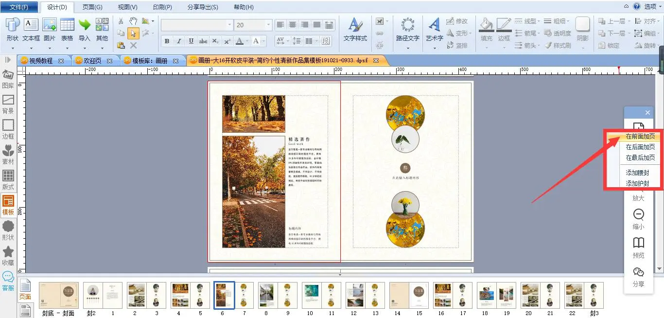 在导航栏选中第6页,点击右侧工具条的加页工具。选择在前面、在后面或者在最后加页,点击“在前面加页”,第6页的前面就会加上双页。
