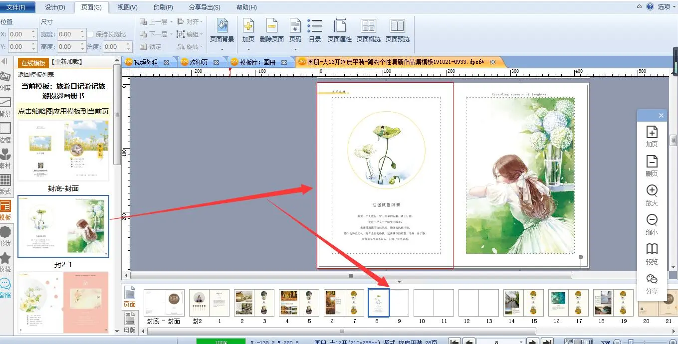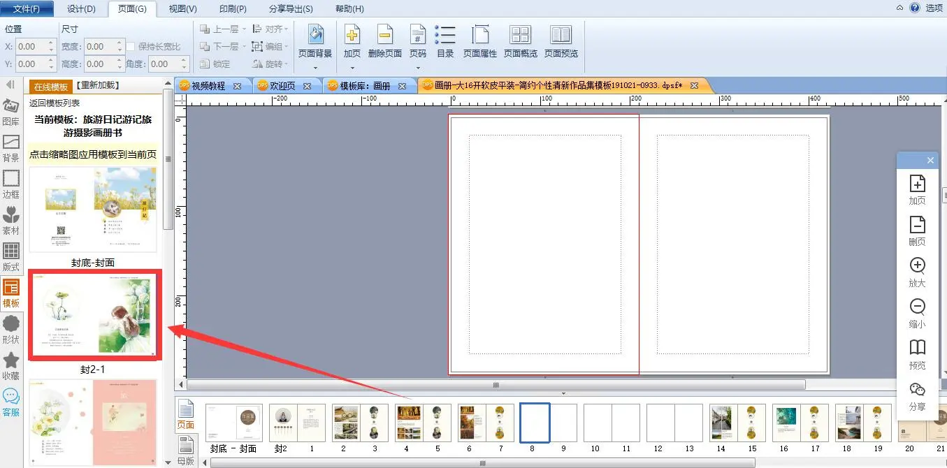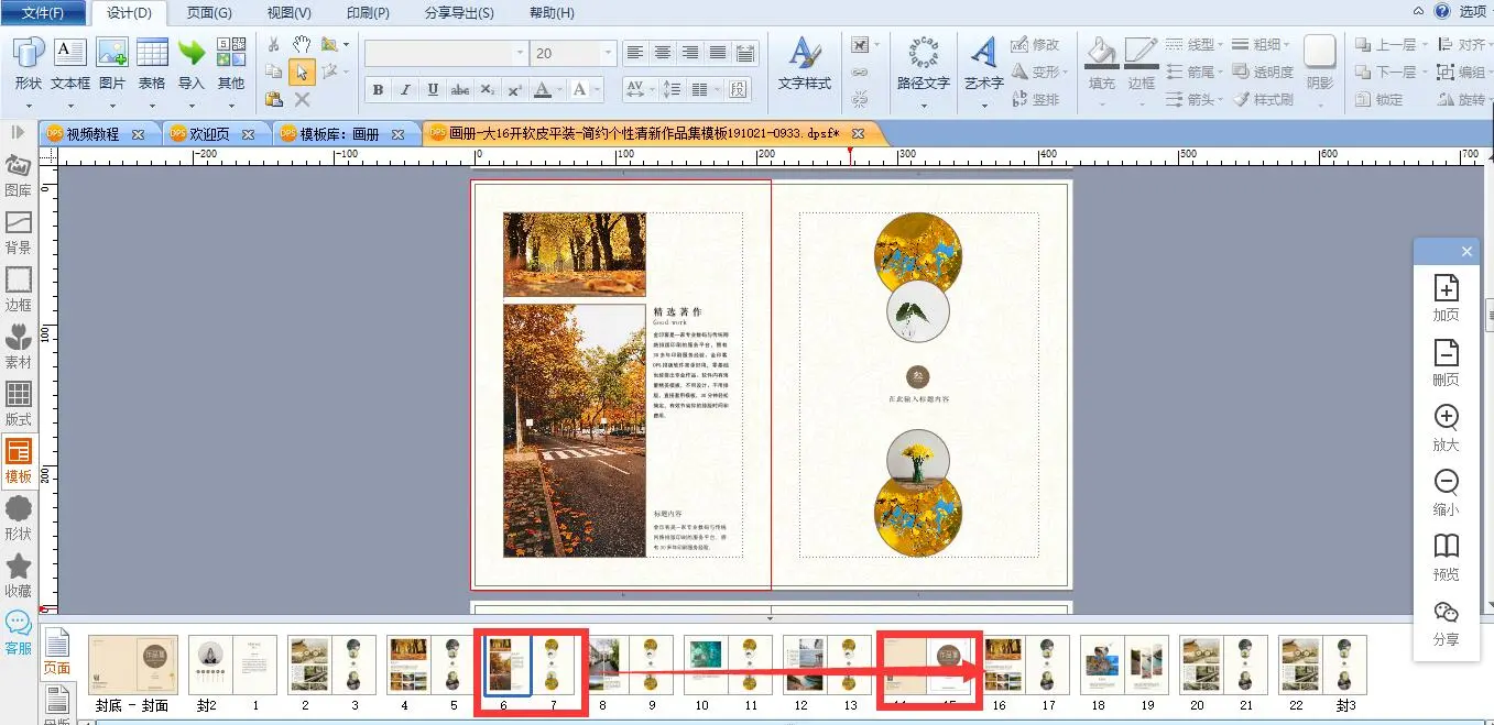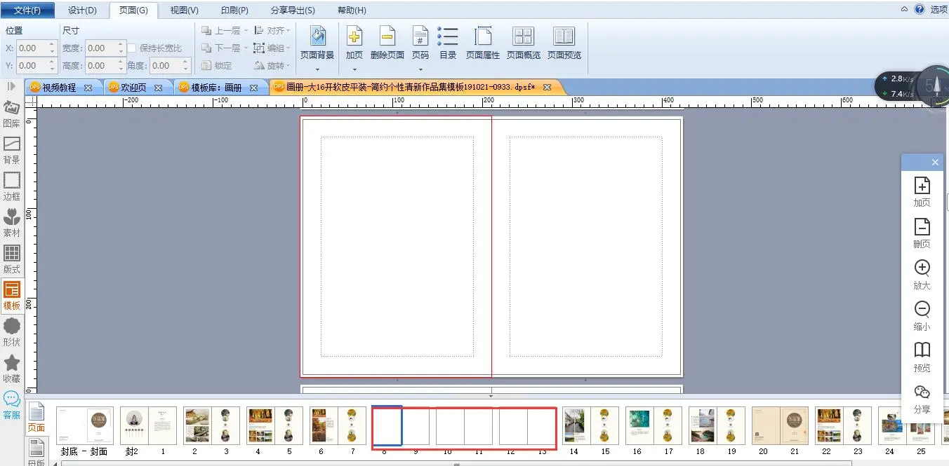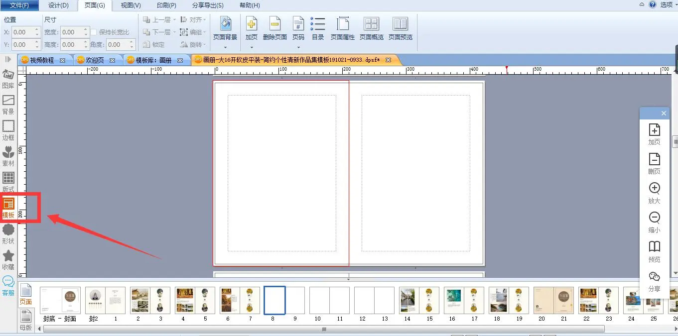 如图,如果想在第14页前面添加其它模板的页面,可以先在第14页前面加页。