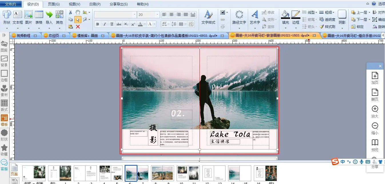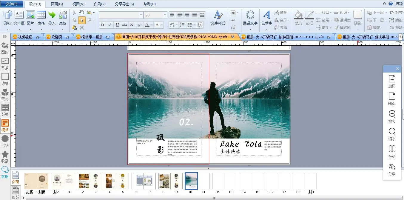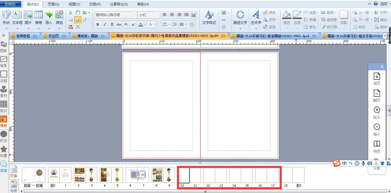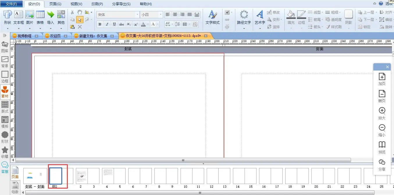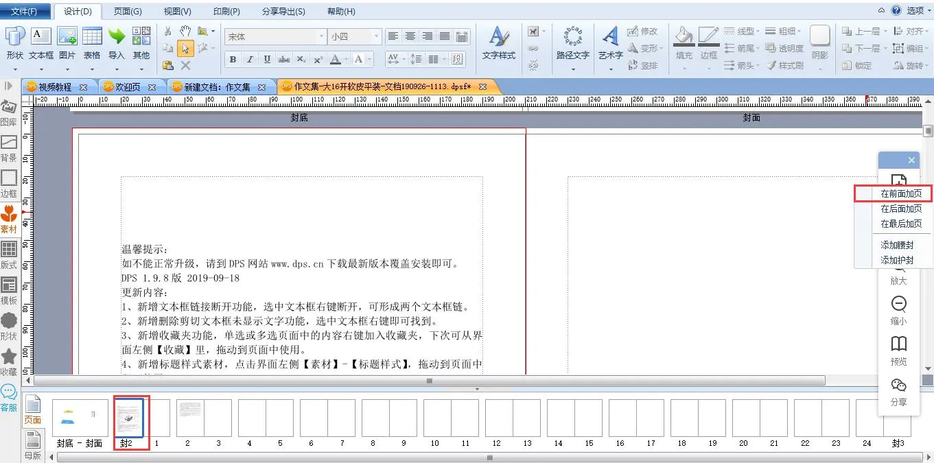 点击编辑页面下面的小图封二,再点击页面右侧的“加页”,点击“在前面加页”,加页就完成了。