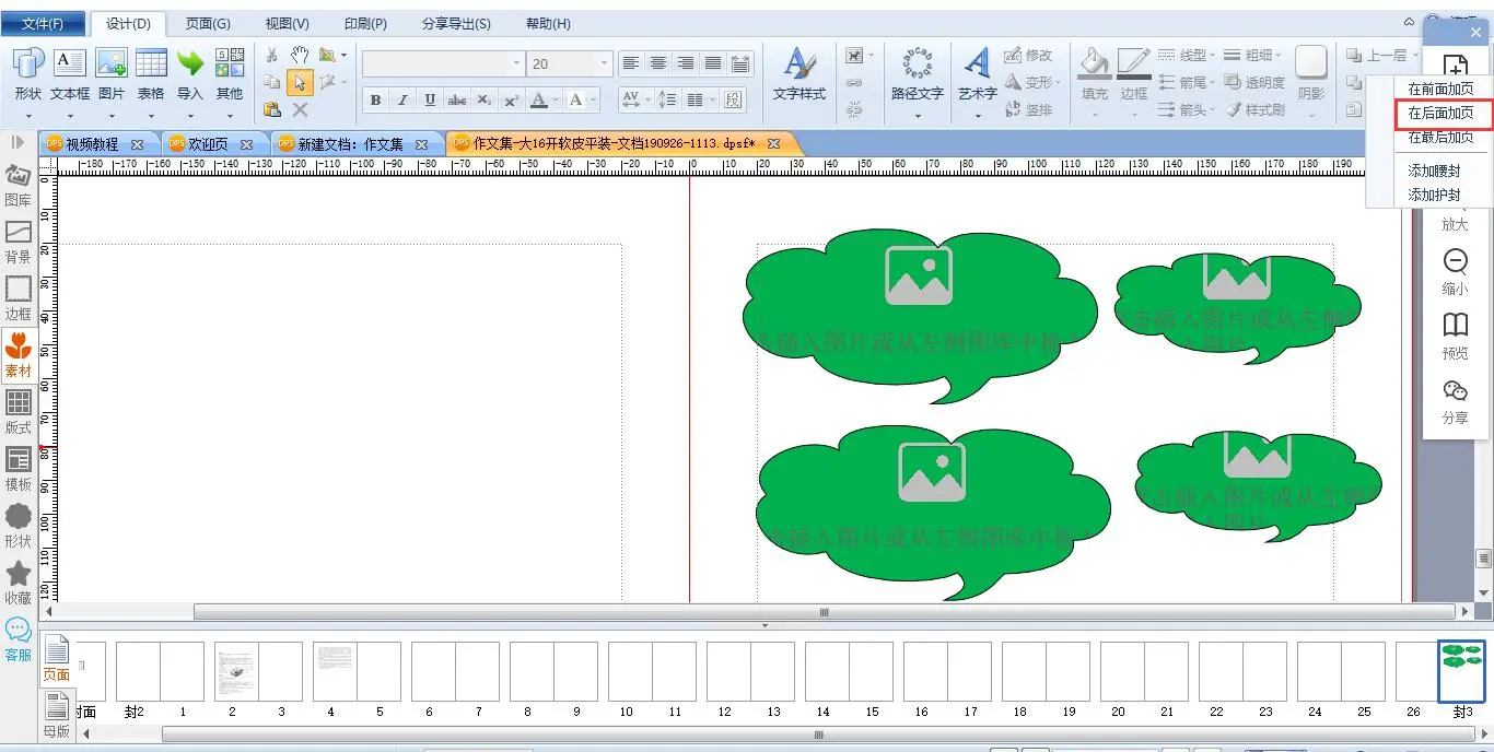 同样点击编辑页面下面的小图封三,再点击页面右侧的“加页”,点击“在后面加页”,加页就完成了。