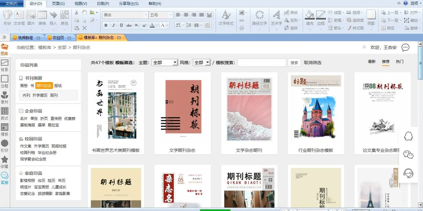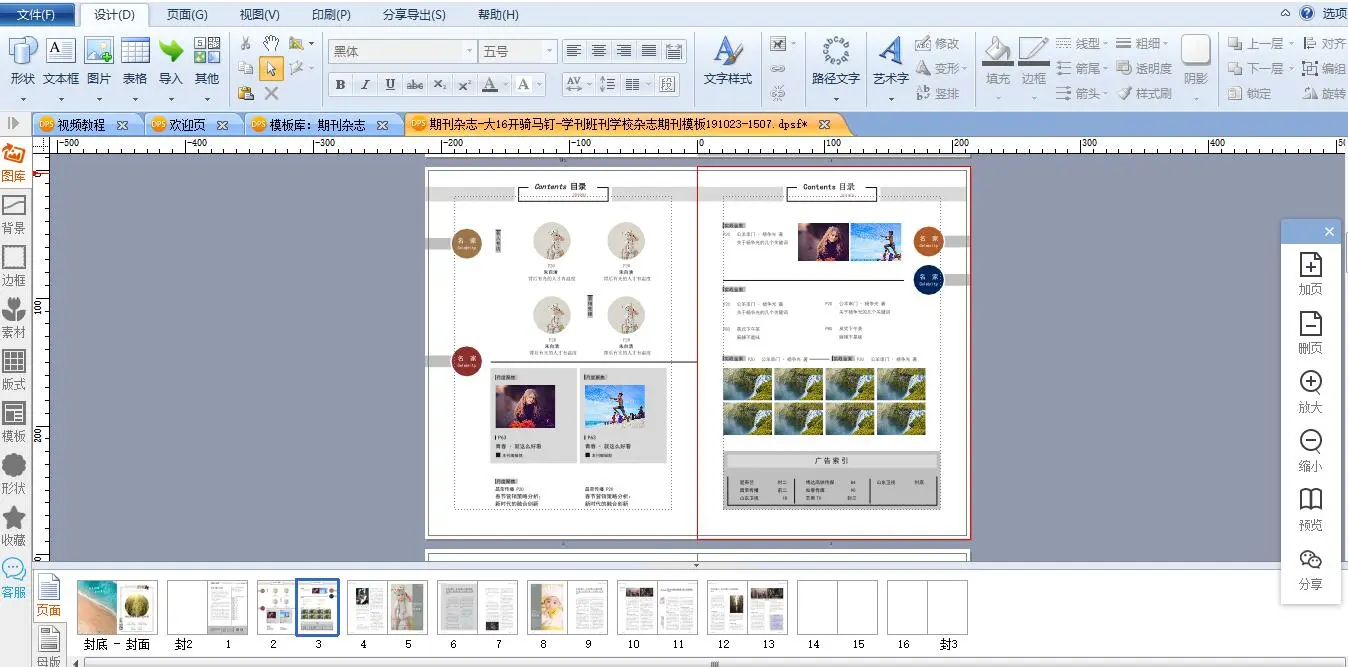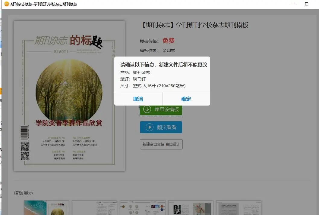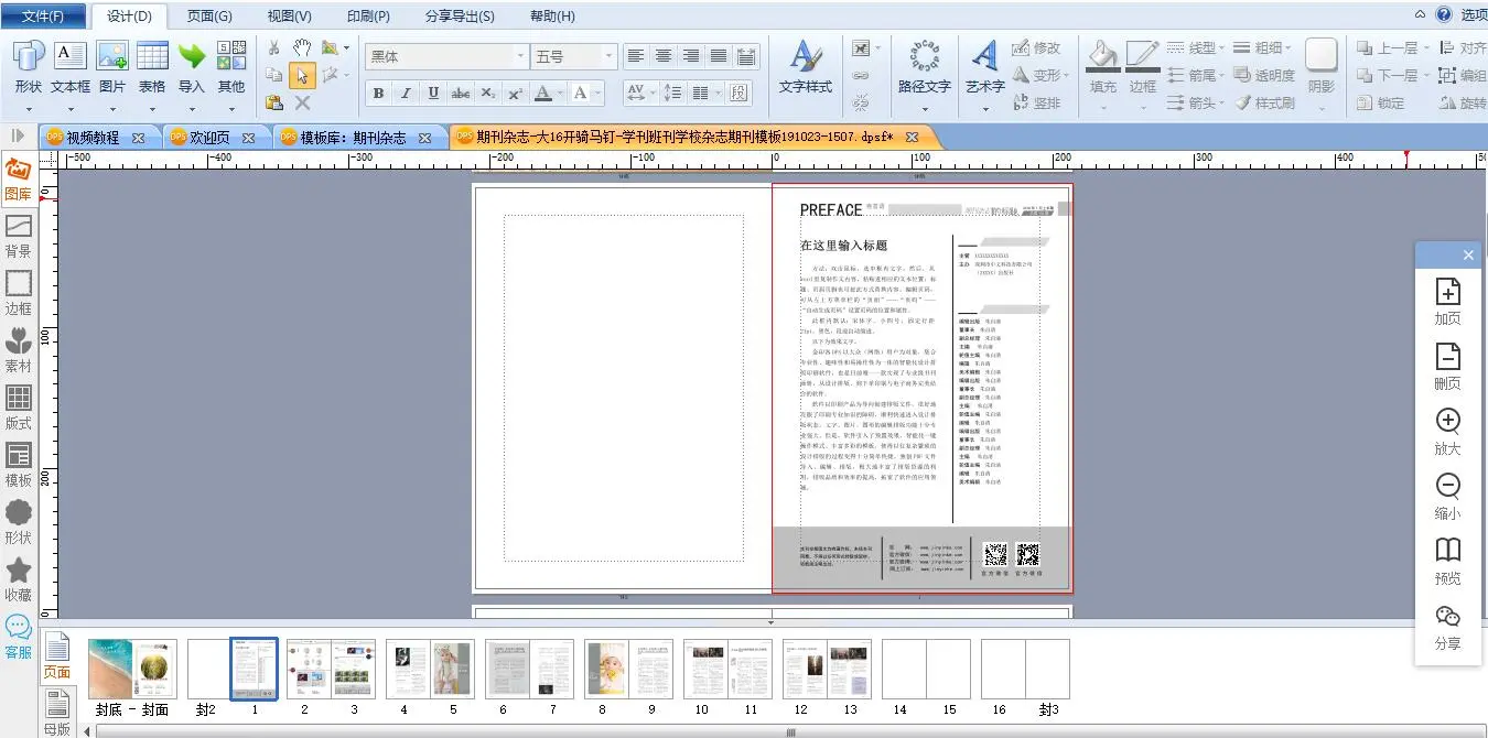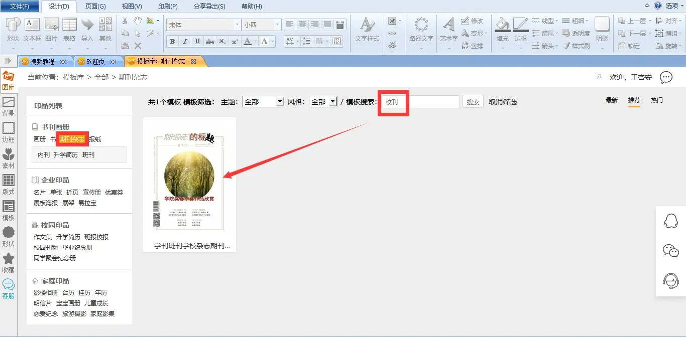 再点击编辑栏左侧的书刊杂志,在上方的模板搜索里输入“校刊”。校刊模板就出来了,随便翻开一本看看。