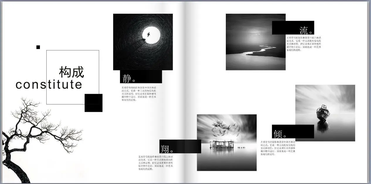 另外,图片的安排一定要按照逻辑顺序,横竖、大小的搭配要尽量增强作品集内容的表现力,也要注意图片与文字的相互配合。