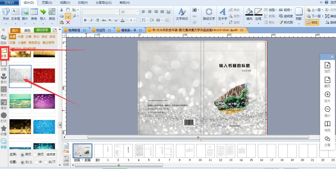 封面有点暗沉,我们可更改一下封面封底的背景。点击左侧的背景,就会出现一系列的背景图片,选择一款喜欢的,点击,背景就自动出现在书籍的封面封底了。