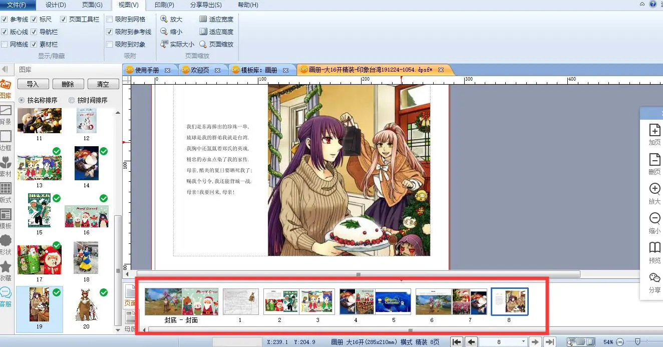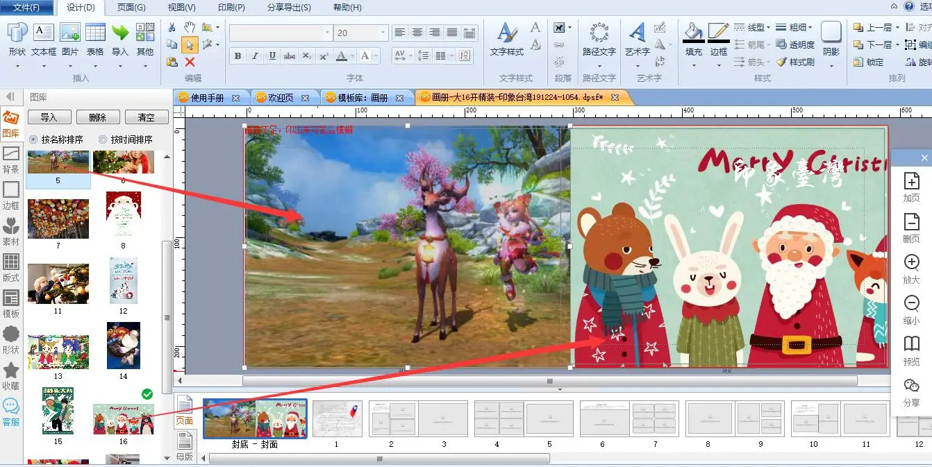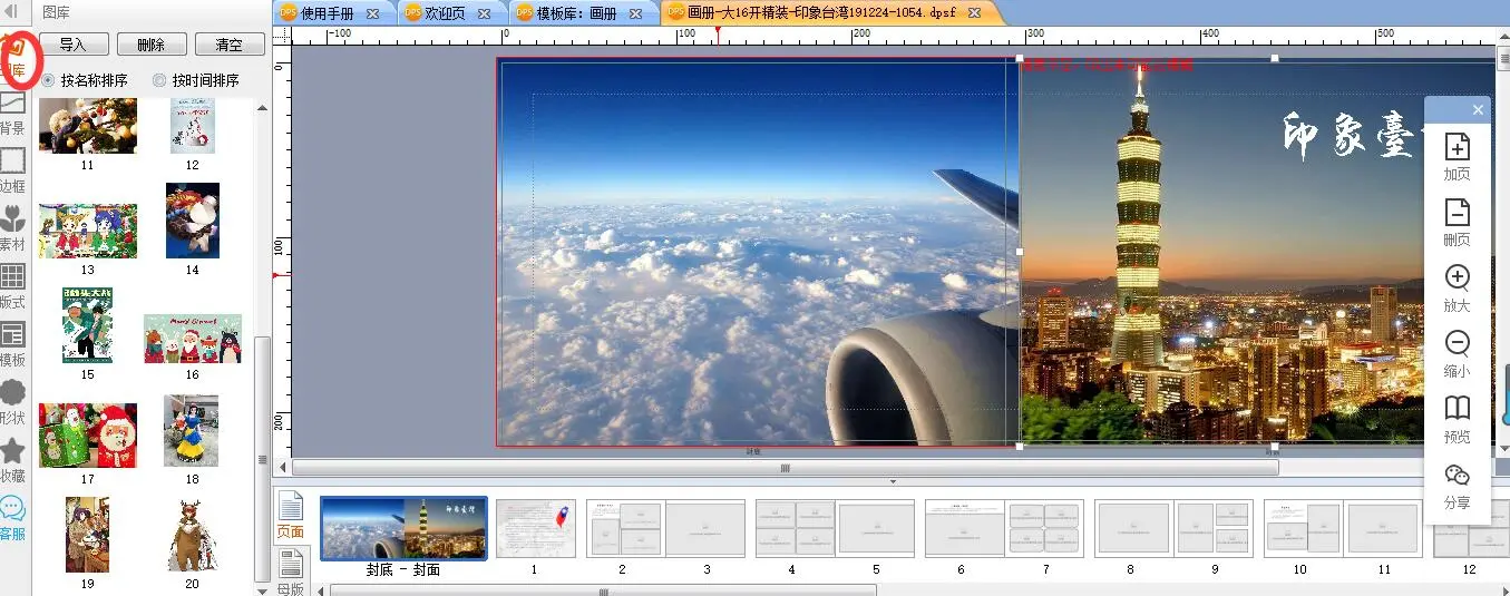 先将封面封底的图片换掉。左边为封底,右边为封面。将“印象台湾”改为“圣诞纪念”。如图,可以看到,选中模板上的图片,将图库里的图片拉到图片上,图片就成功地换掉了。