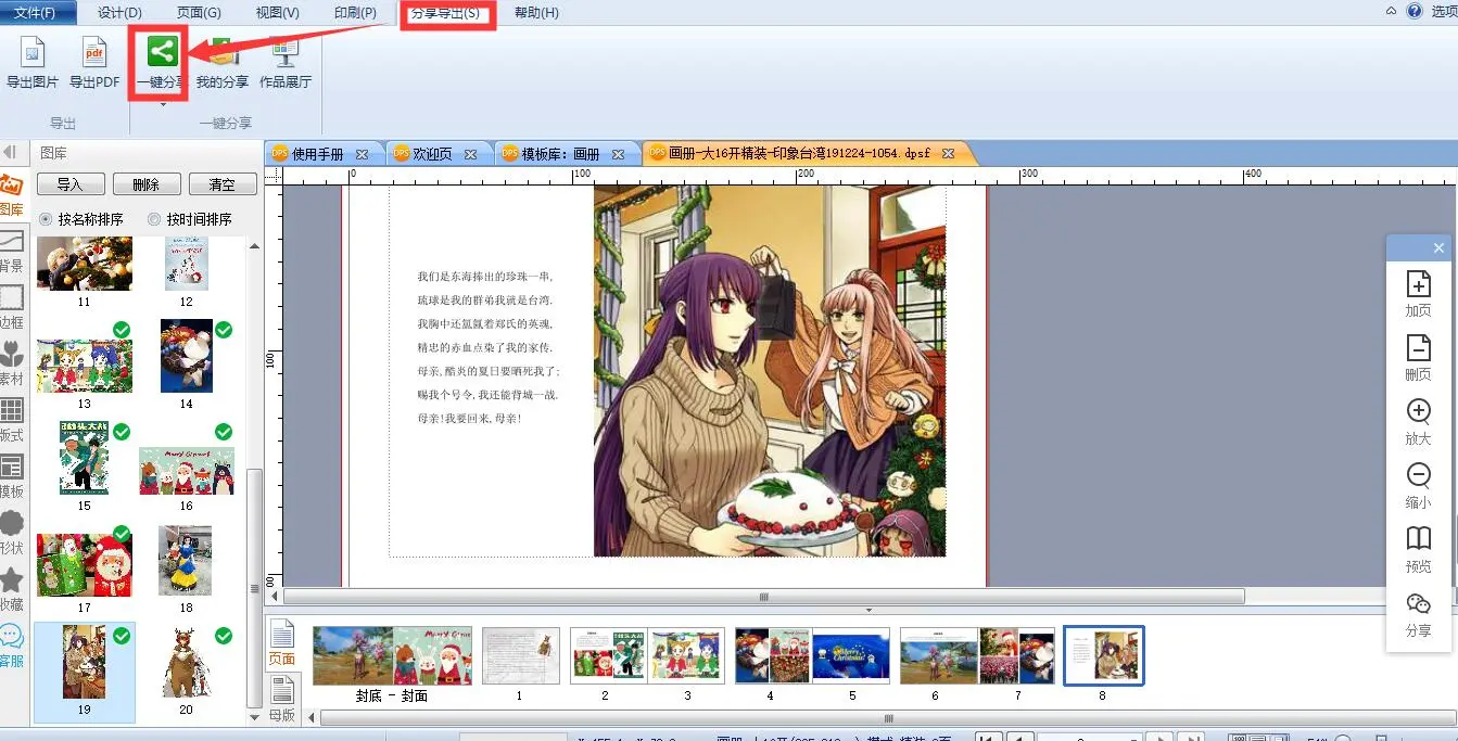 我们来看看这本简易的画册。单击菜单栏的“分享导出”--一健分享。