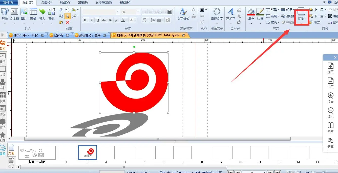 点击界面左侧素材栏的【形状】,可以拖动形状素材到页面中使用。也可以通过【填充】【边框】【阴影】,可设置样式。