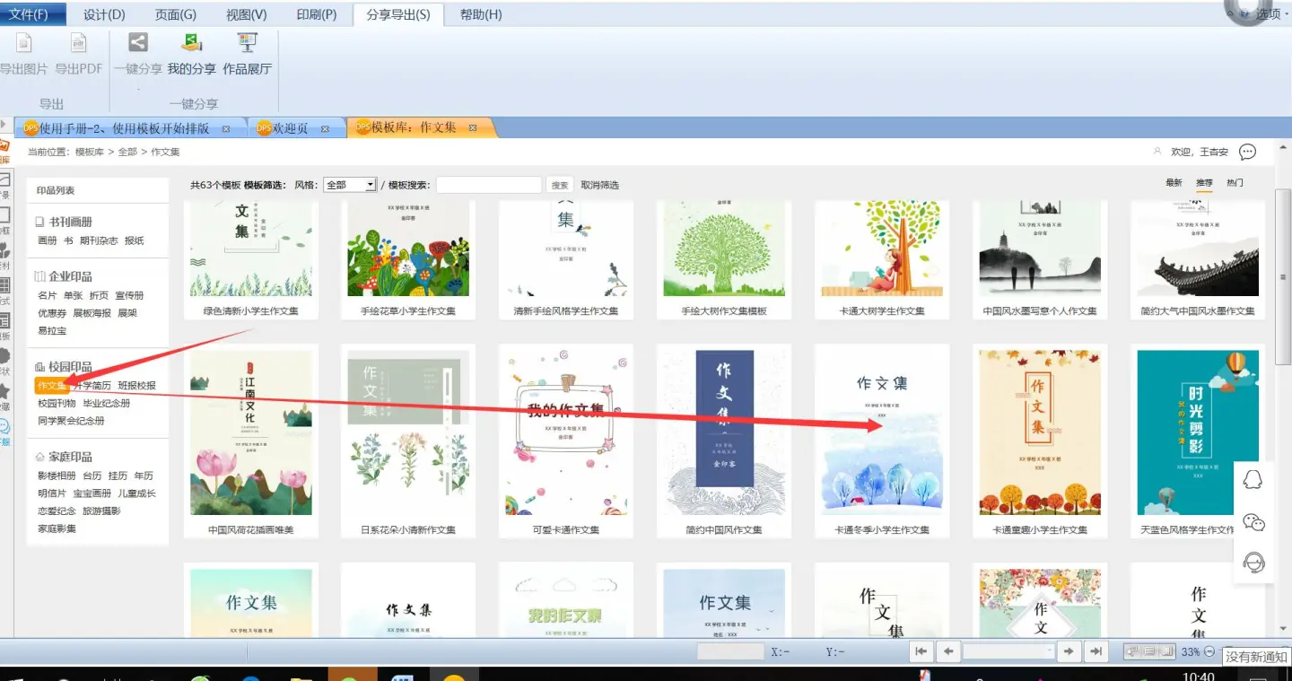 单击模板库,打开模板界面。我们点击左侧的作文集,并在编辑界面选择一款作文集。