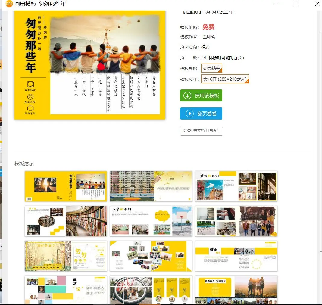 打开一个模板,上面是模板的基本信息,下面是所有的版面效果。只需要替换文字和图片即可。