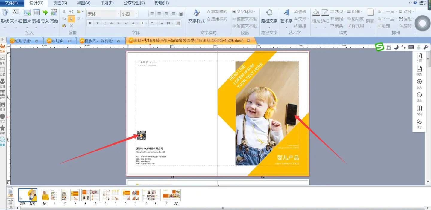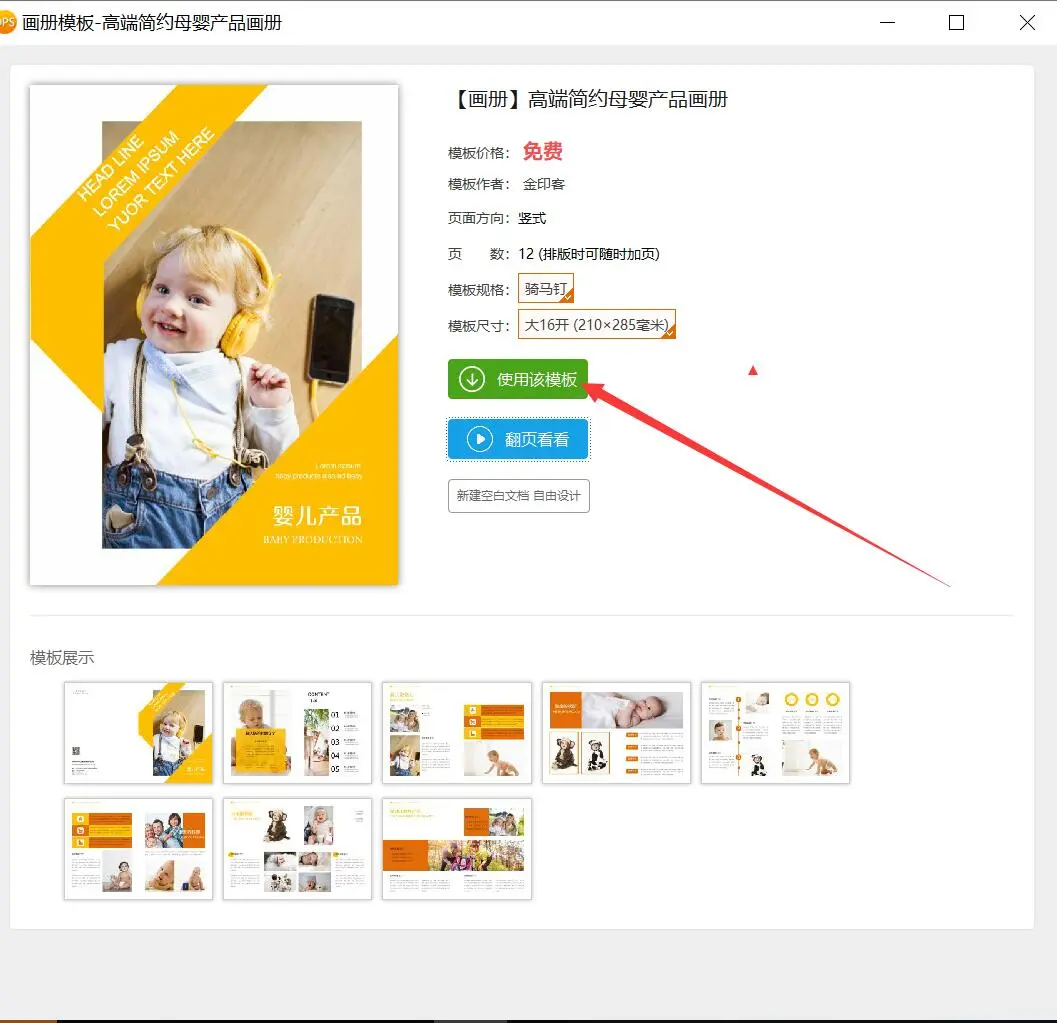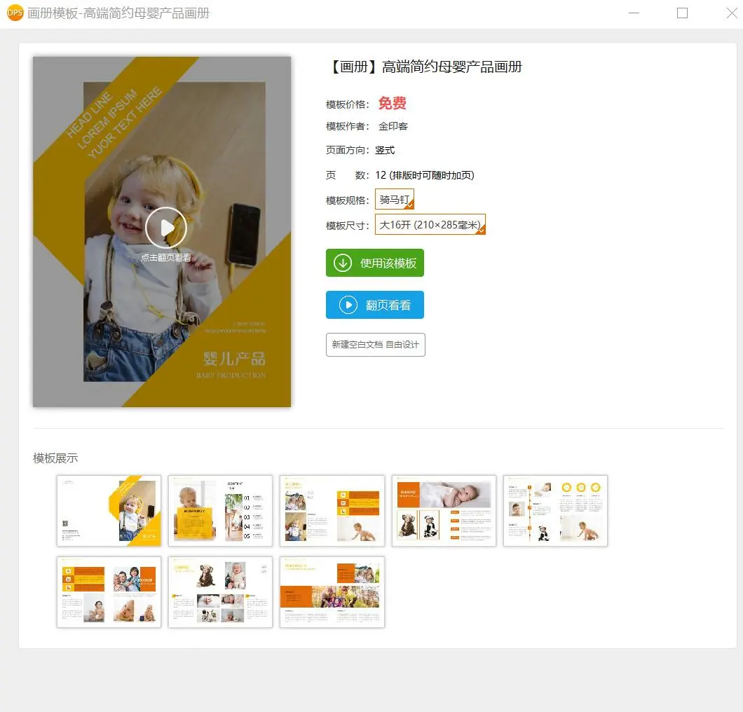 是不是啊,无论你要哪种风格的都用。我们打开一款模板看看。我们打开一本母婴产品手册的模板,出现了模板的展示页。