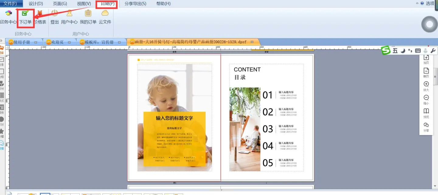 是不是很简单啊,另外,金印客DPS软件还可以在线下单印刷,我们点击菜单栏的印刷--下订单,就可以了。