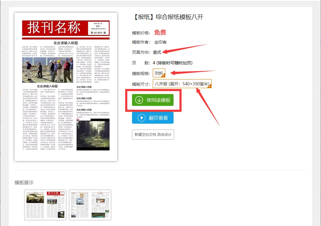 3、选好模板样式后,确定页面方向、页数、模板规格、模板尺寸,点击“使用该模板”。