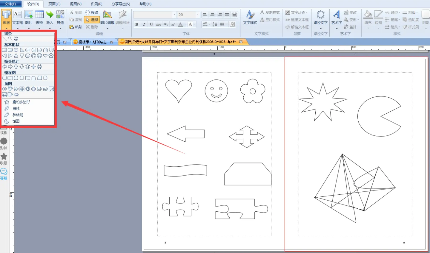 在形状工具的下拉菜单里,已经预设了多种基本形状、箭头总汇、流程图、拼图等,只需将形状拖入页面,调大小、位置即可。