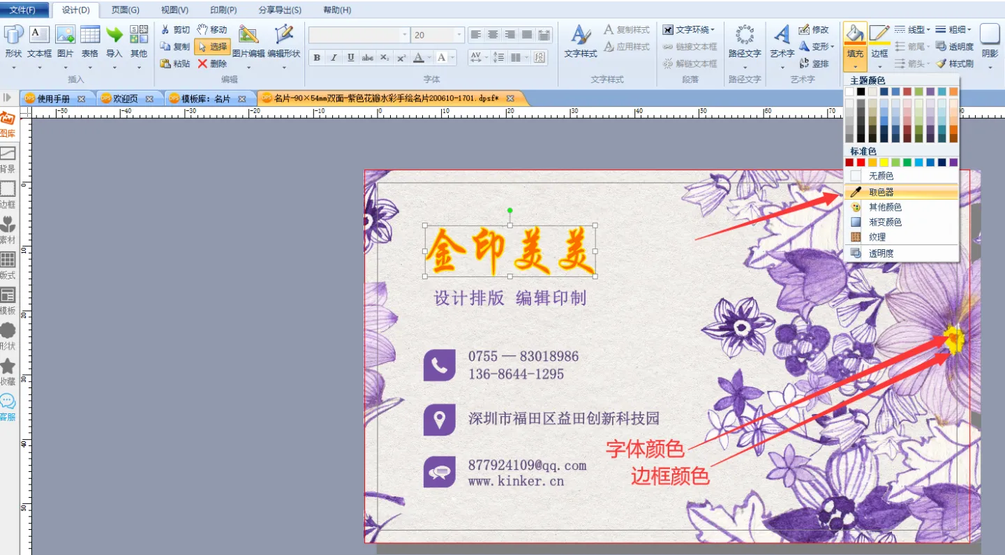 可以利用颜色填充工具,美化字体,在本案例中,我们用取色器选用了花蕊的颜色。