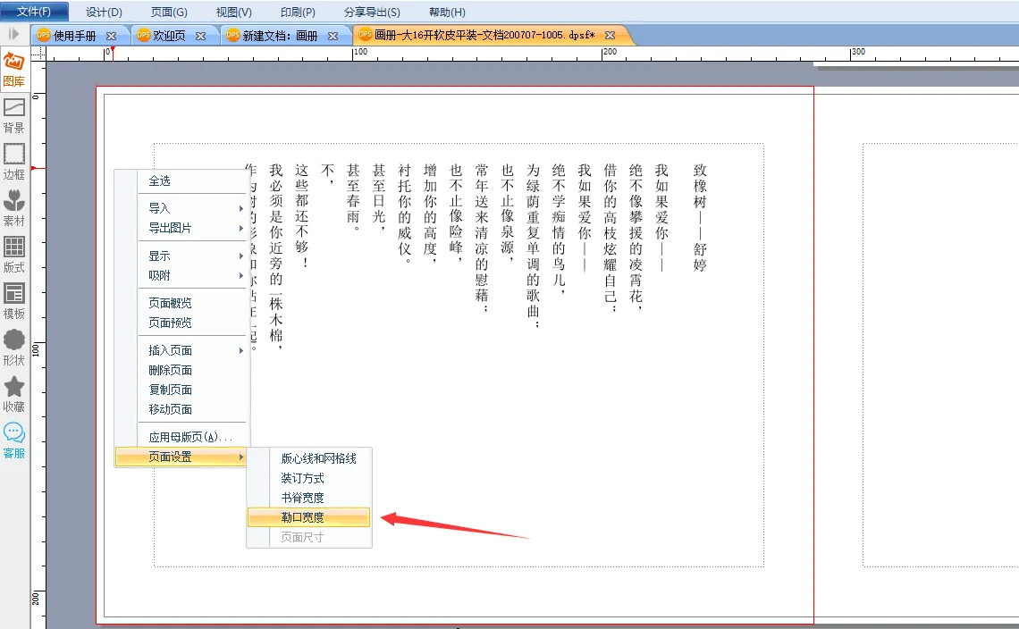 在界面空白外,单击鼠标右键,出现[页面设置]——[勒口宽度]