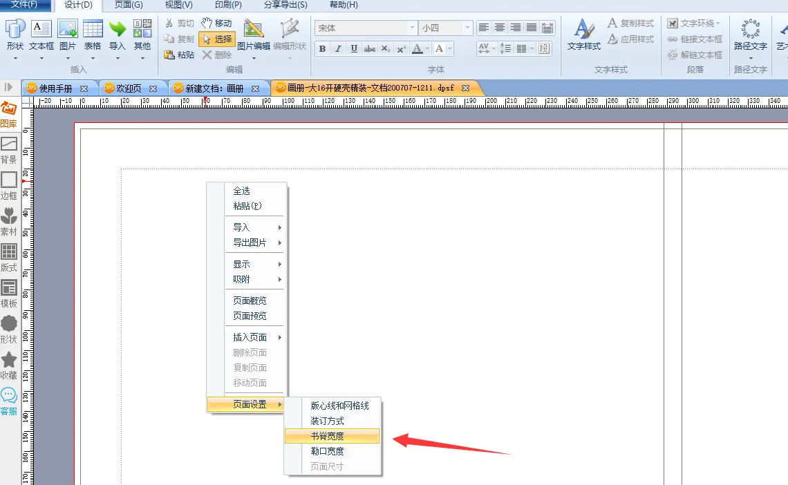 使用方法:在界面空白外,单击鼠标右键,出现[页面设置]——[书脊宽度]