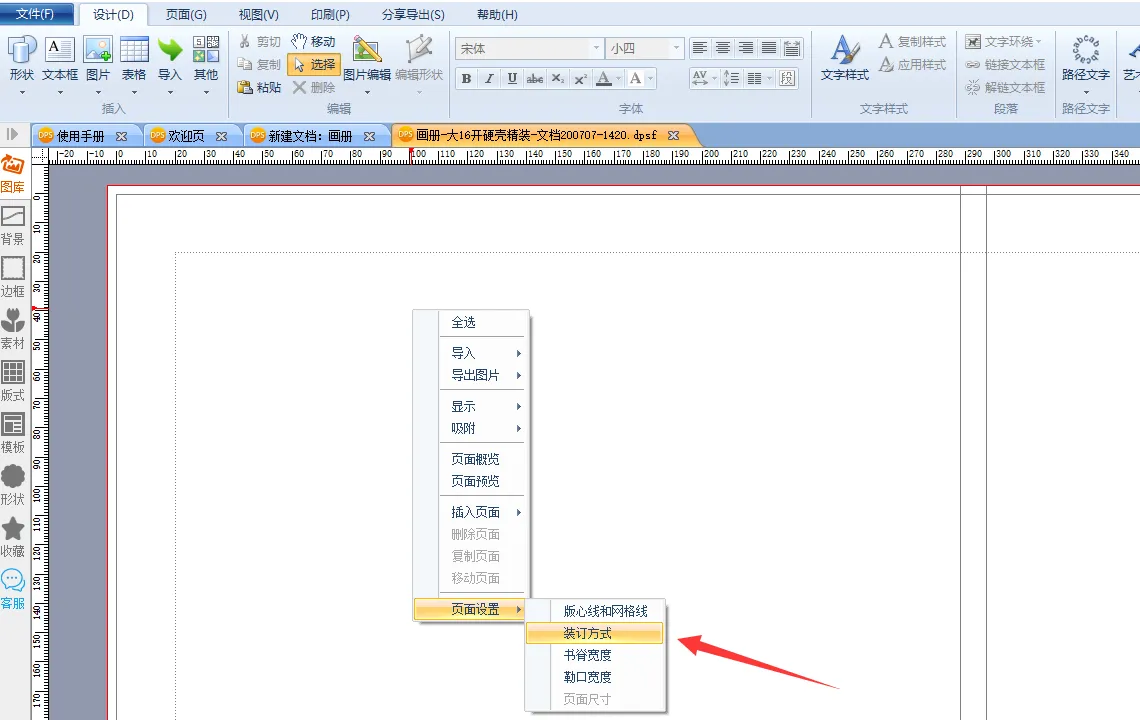 使用方法:在界面空白外,单击鼠标右键,出现[页面设置]——[装订方式]