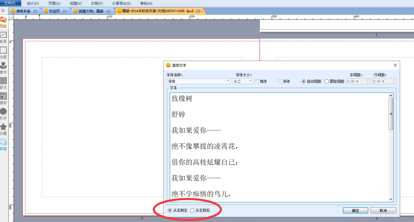 输入文字,左下角有两个选项:从右到左,从左到右。