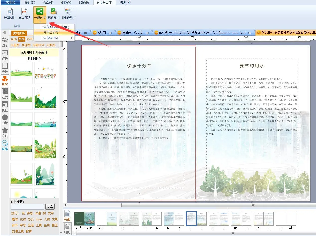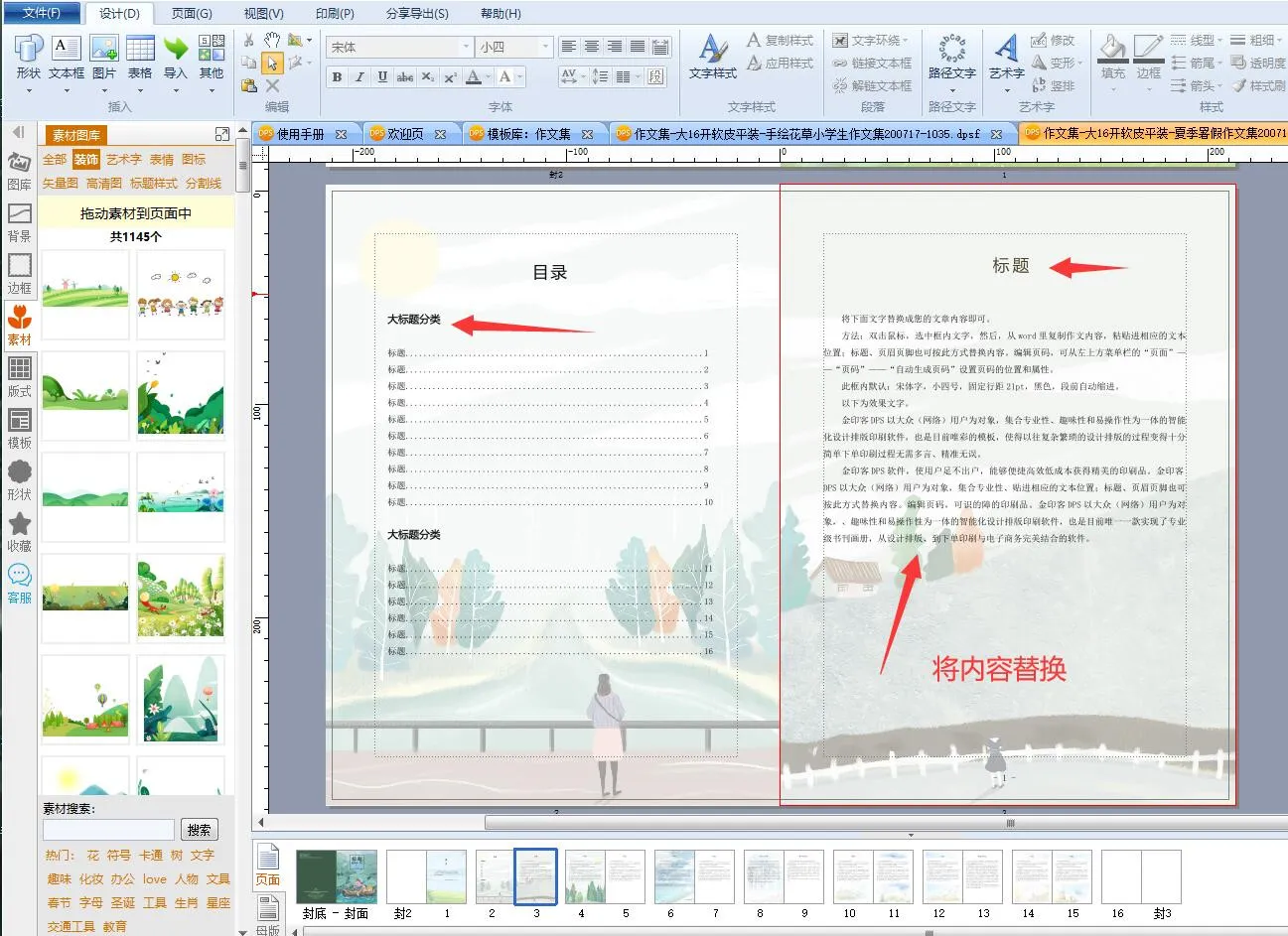 2、将作文集模板上的文字和图片替换成自己的内容。